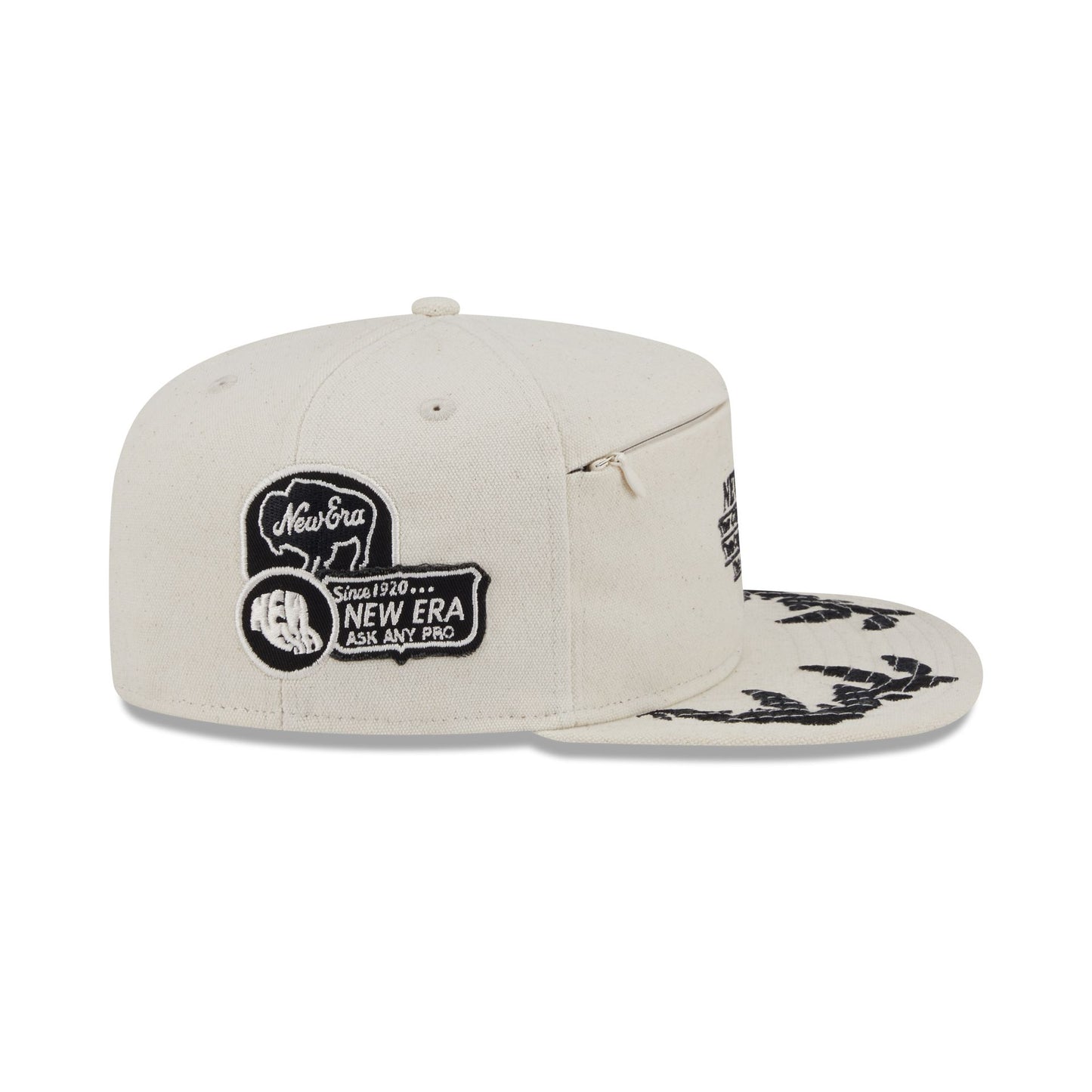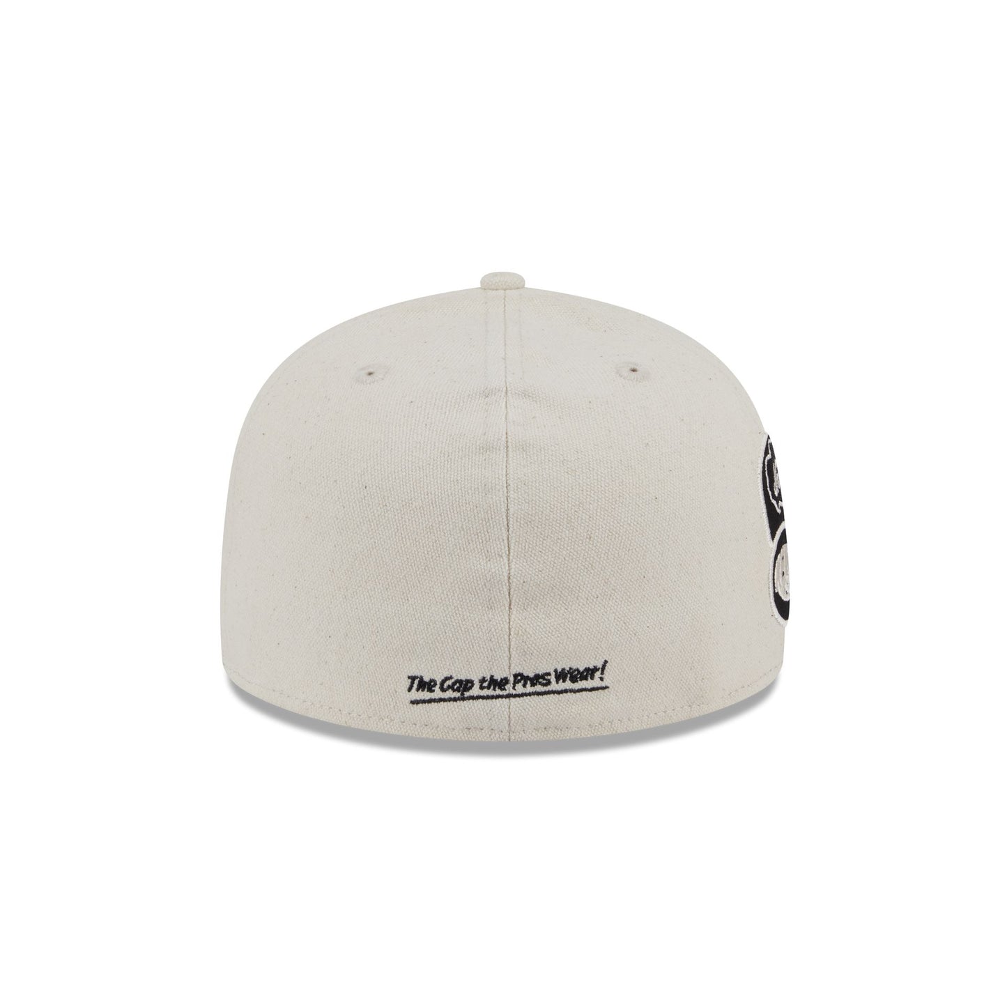 The New Era Cap Front Zip 59FIFTY A-Frame Fitted Cap features an embroidered New Era wordmark and zipper at the front panels with cotton applique logos at the right-wear side. Additional details include embroidered leaves at the visor, "The Caps the Pros Wear!" wordmark at the rear, and a green undervisor. This cap has a cotton canvas fabrication throughout.