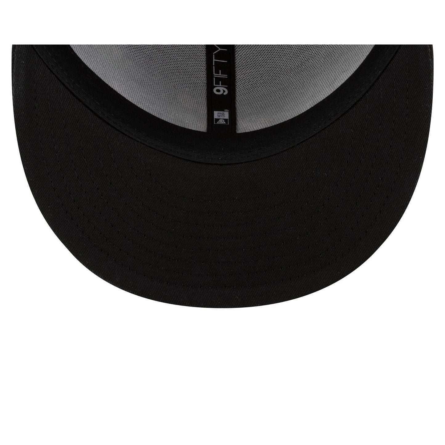 The Golf is Good All Over 9FIFTY Snapback features an embroidered New Era script logo at the front panels with embroidered golf icons throughout the cap. Additional details include golf clubs embroidered above an adjustable snapback closure at the rear.