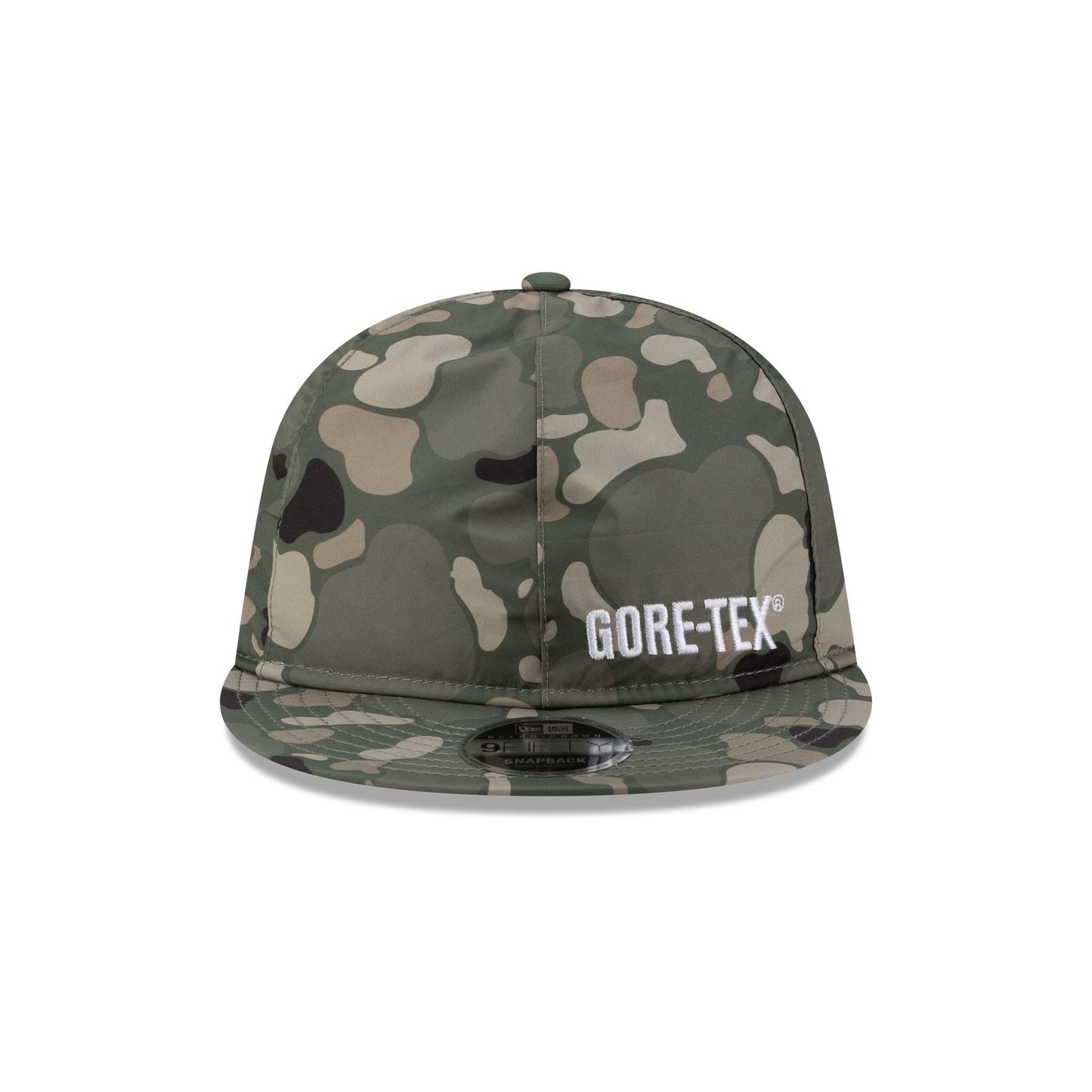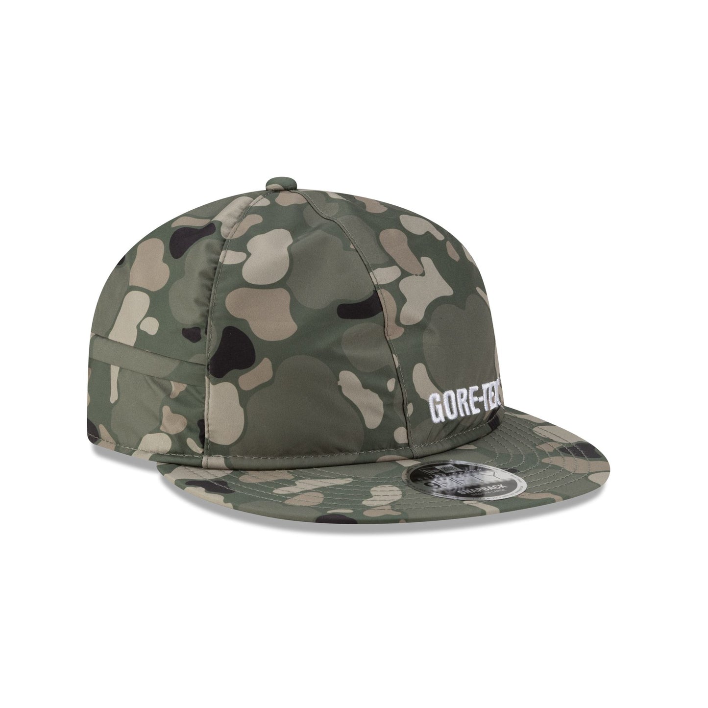 The New Era Cap Gore-Tex Outdoor Camo Retro Crown 9FIFTY Strapback Cap features an embroidered Gore-Tex logo at the front panel with a New Era Flag at the left-wear side. Additional details include a zip pocket at the right-wear side and a metal triangle loop above a Fidlock magnetic closure at the rear.