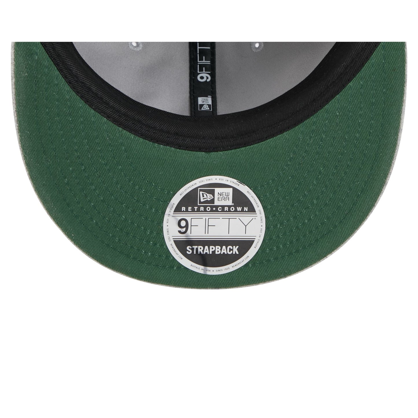 The New Era Cap Heather Gray Melton Wool Retro Crown 9FIFTY Strapback Cap features New Era Flag at the left-wear side with a green undervisor and an adjustable leather strap at the rear.