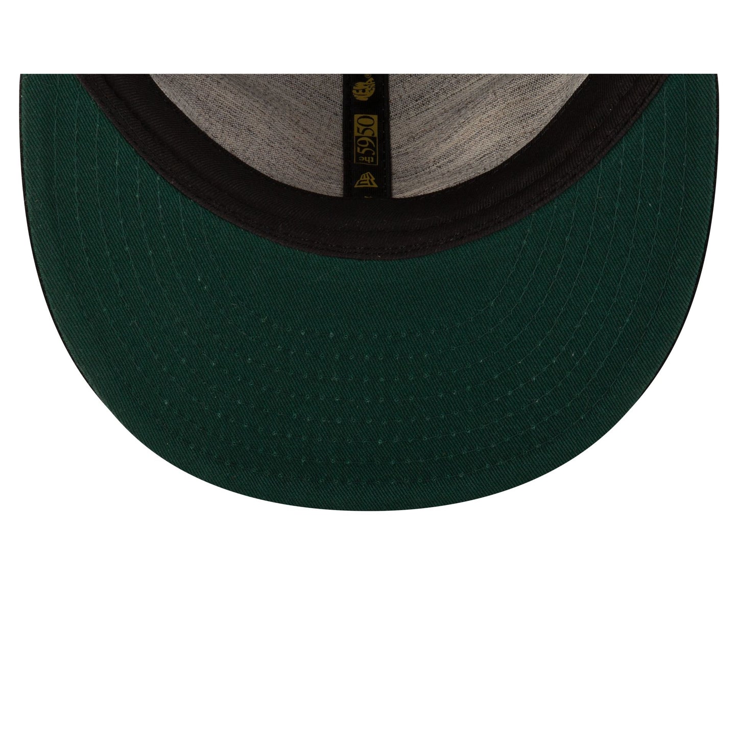 The New Era Cap Heather Gray Retro Crown 59FIFTY Fitted Cap features an embroidered and stitch down applique New Era wordmark and flags at the front panels. Below reads "The Cap the Pros Wear." Additional details include an embroidered "the 5950" logo at the rear and a green undervisor.