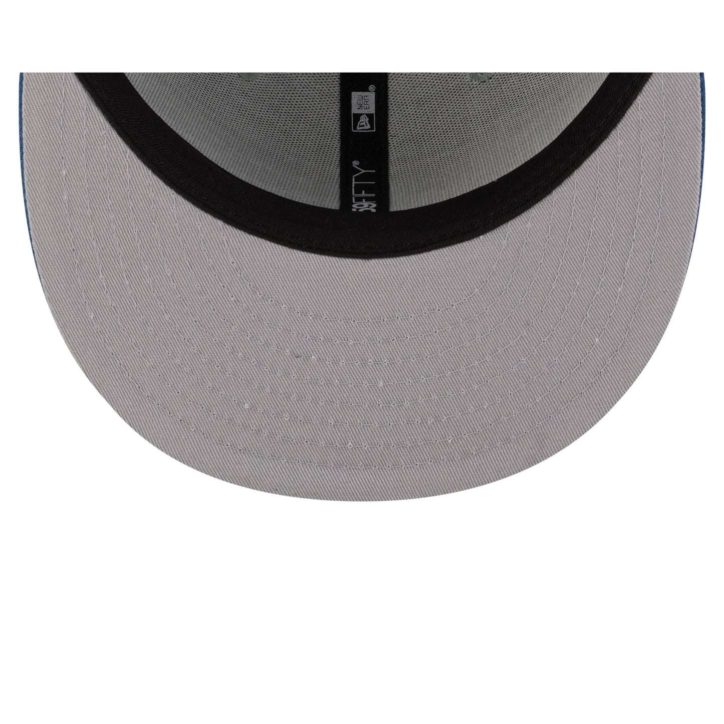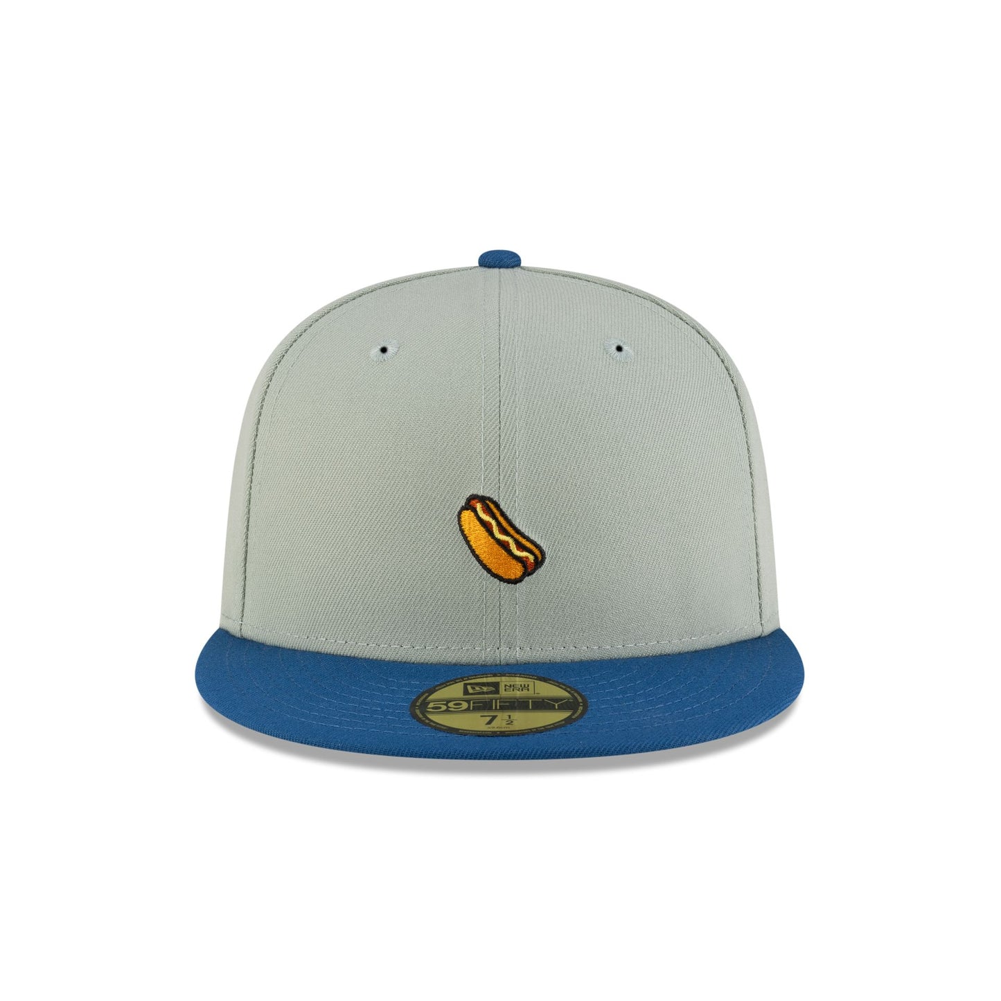 The New Era Cap Hot Dog 59FIFTY Fitted Cap features an embroidered hot dog icon at the front panels with New Era Flag at the left-wear side, a blue visor, and a gray undervisor.