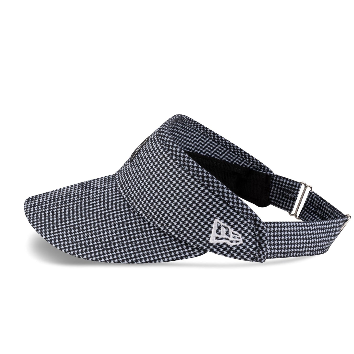 The New Era Cap Houndstooth Black Visor Adjustable Cap features a woven New Era patch at the front panels with a New Era Golf logo at the right-wear side, a black undervisor, and an adjustable D-Ring closure at the rear.