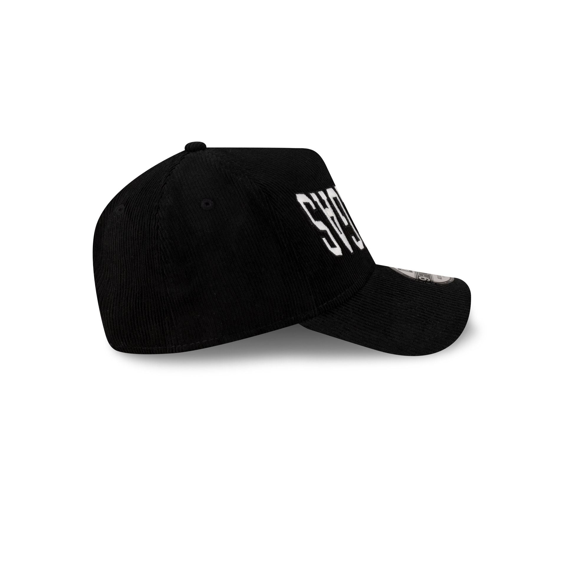 The New Era Cap Las Vegas 9FORTY A-Frame Snapback features a glow-in-the-dark embroidered city wordmark at the front panels with a New Era Flag at the left-wear side, a snapback closure at the rear, and a green undervisor.