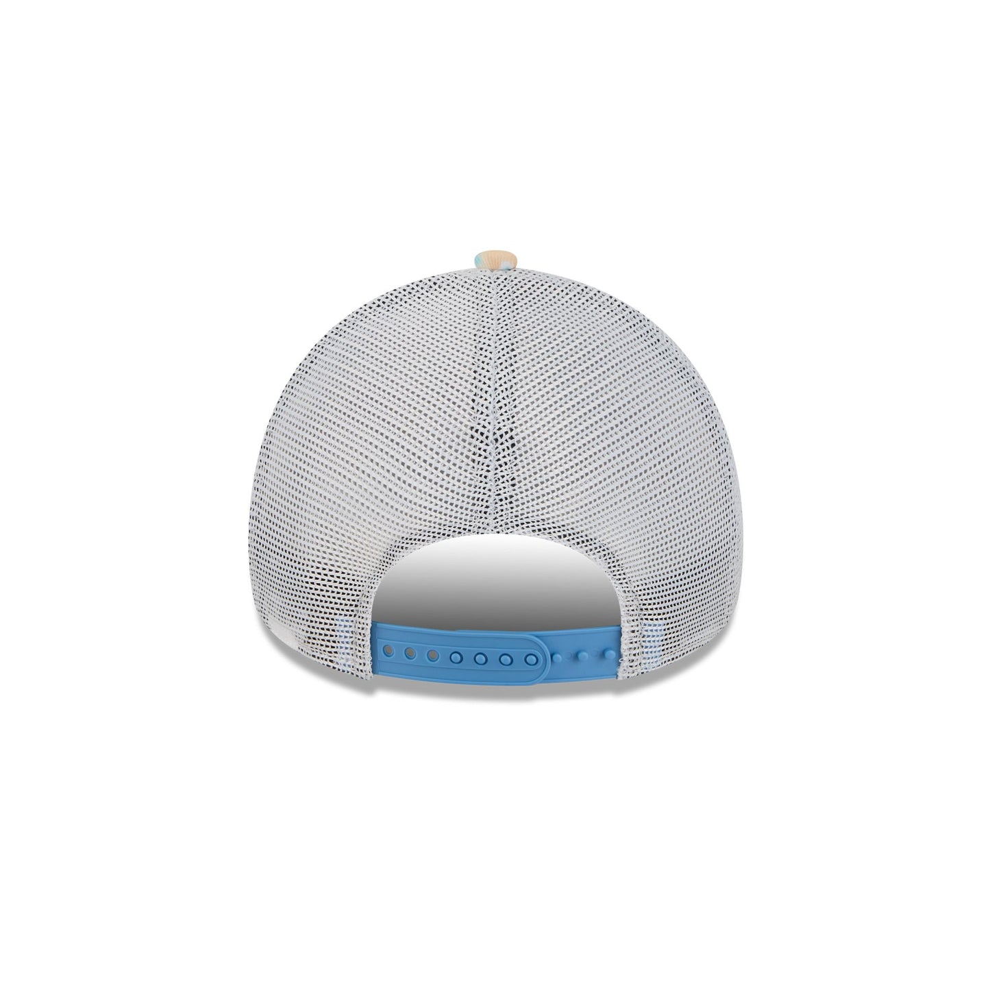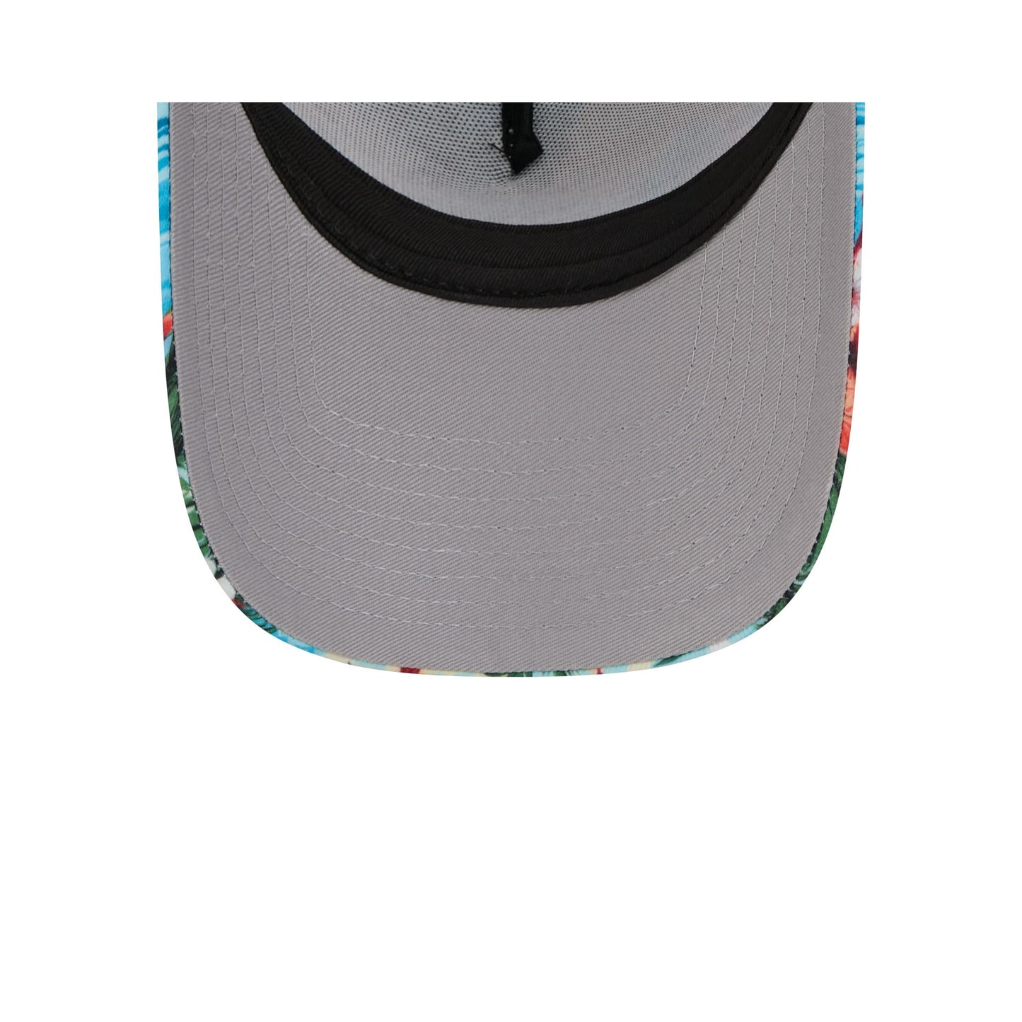 The New Era Cap Mele Kalikimaka 9FORTY A-Frame Trucker features an embroidered Mele Kalikimaka Santa patch at the front panels against a Hawaiian print. Additional details include an adjustable snapback closure at a mesh rear.