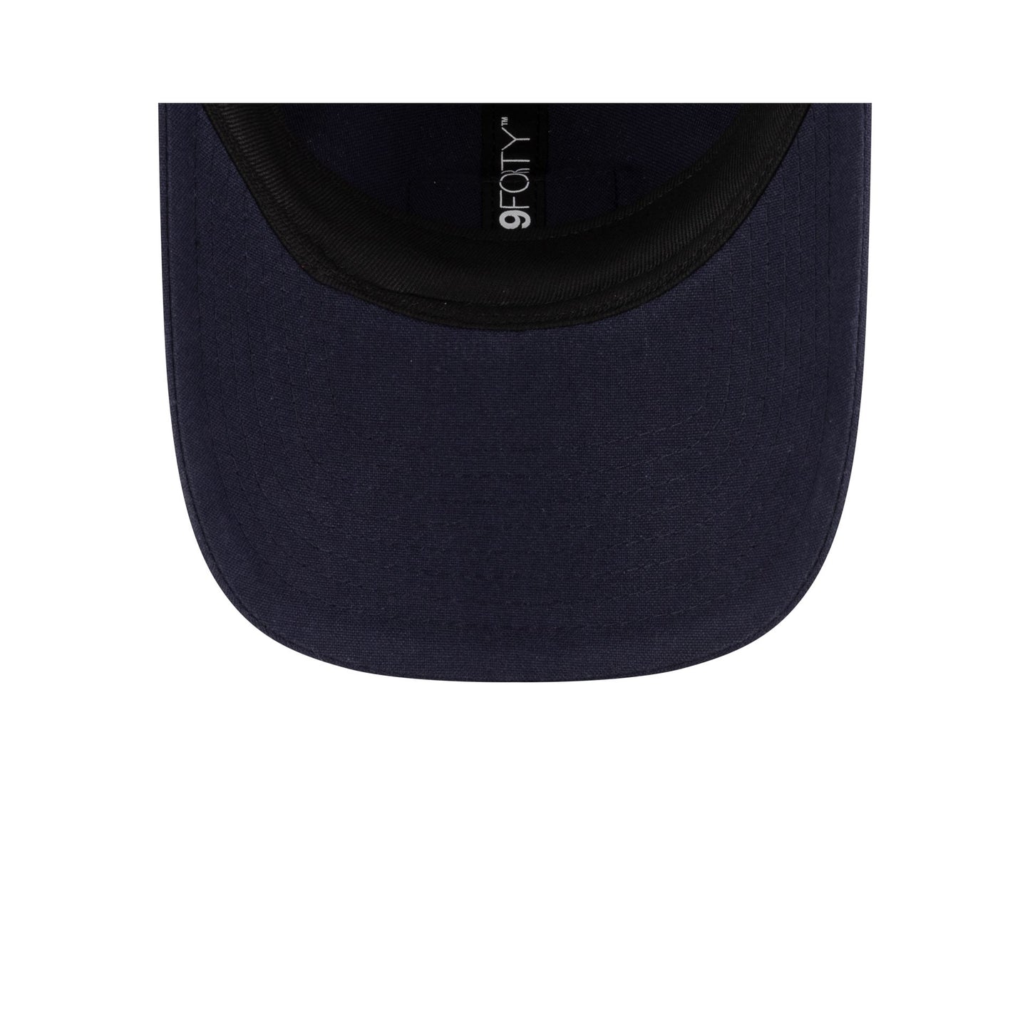 The New Era Cap Navy Label 9FORTY Adjustable Cap features a woven New Era tag at the front panels with an adjustable D-Ring closure at the rear.
