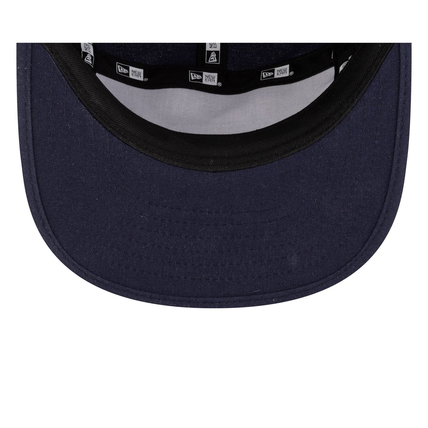 The New Era Cap Navy Label Camper Strapback Cap features an embroidered New Era patch at the front panels with perforated rear panels and a strapback closure at the rear.