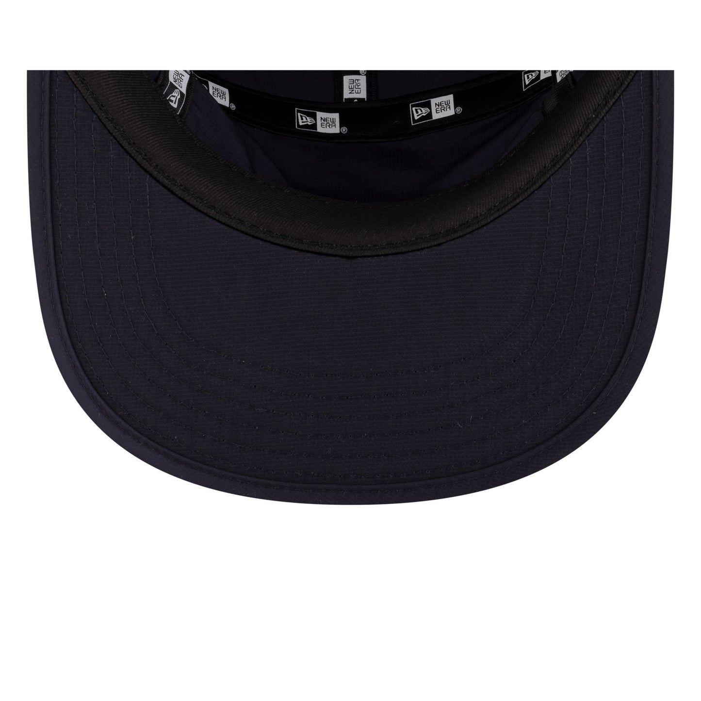 The New Era Cap Navy Nylon Camper Strapback Cap features a woven New Era tag at the front panels with perforated rear panels and a strapback closure at the rear.