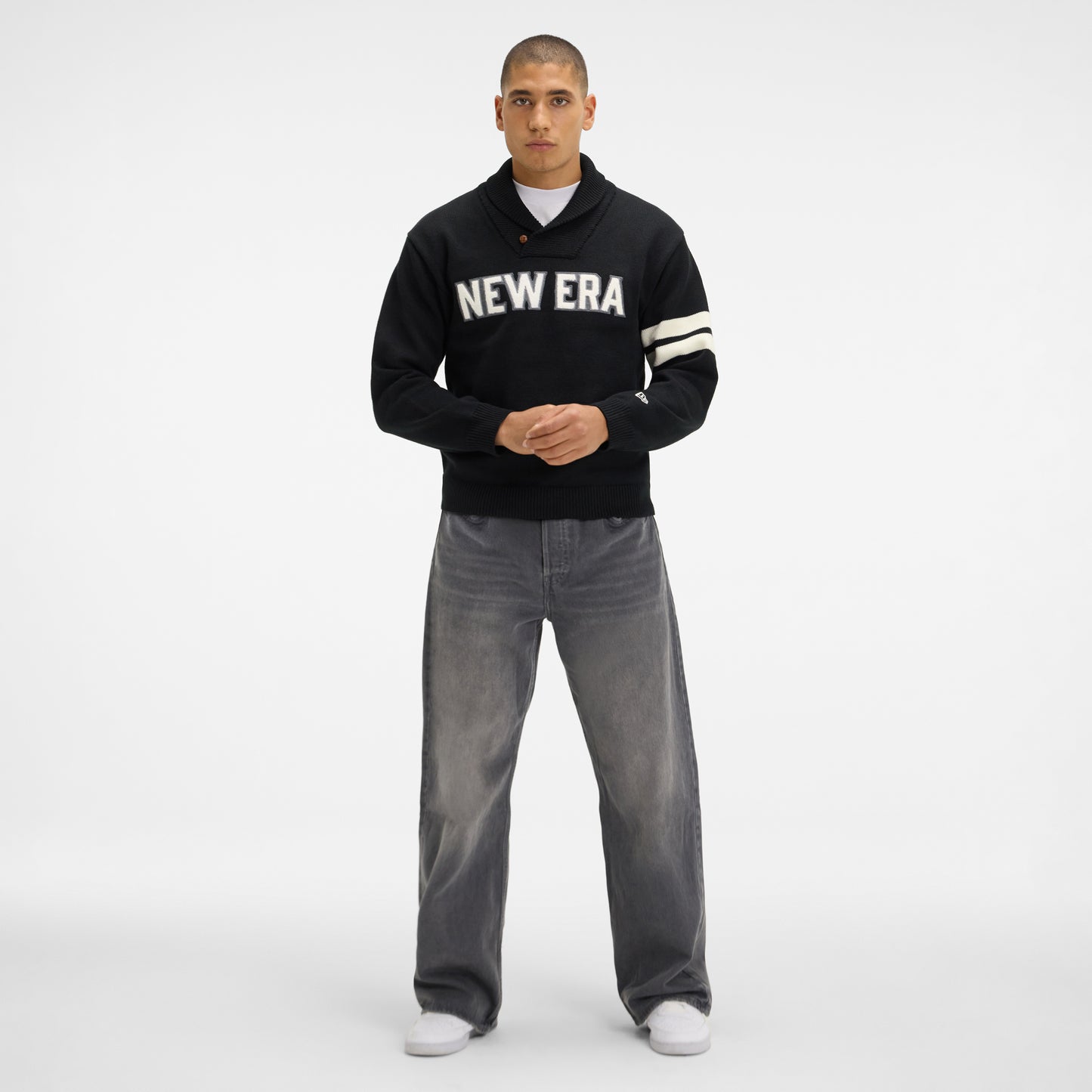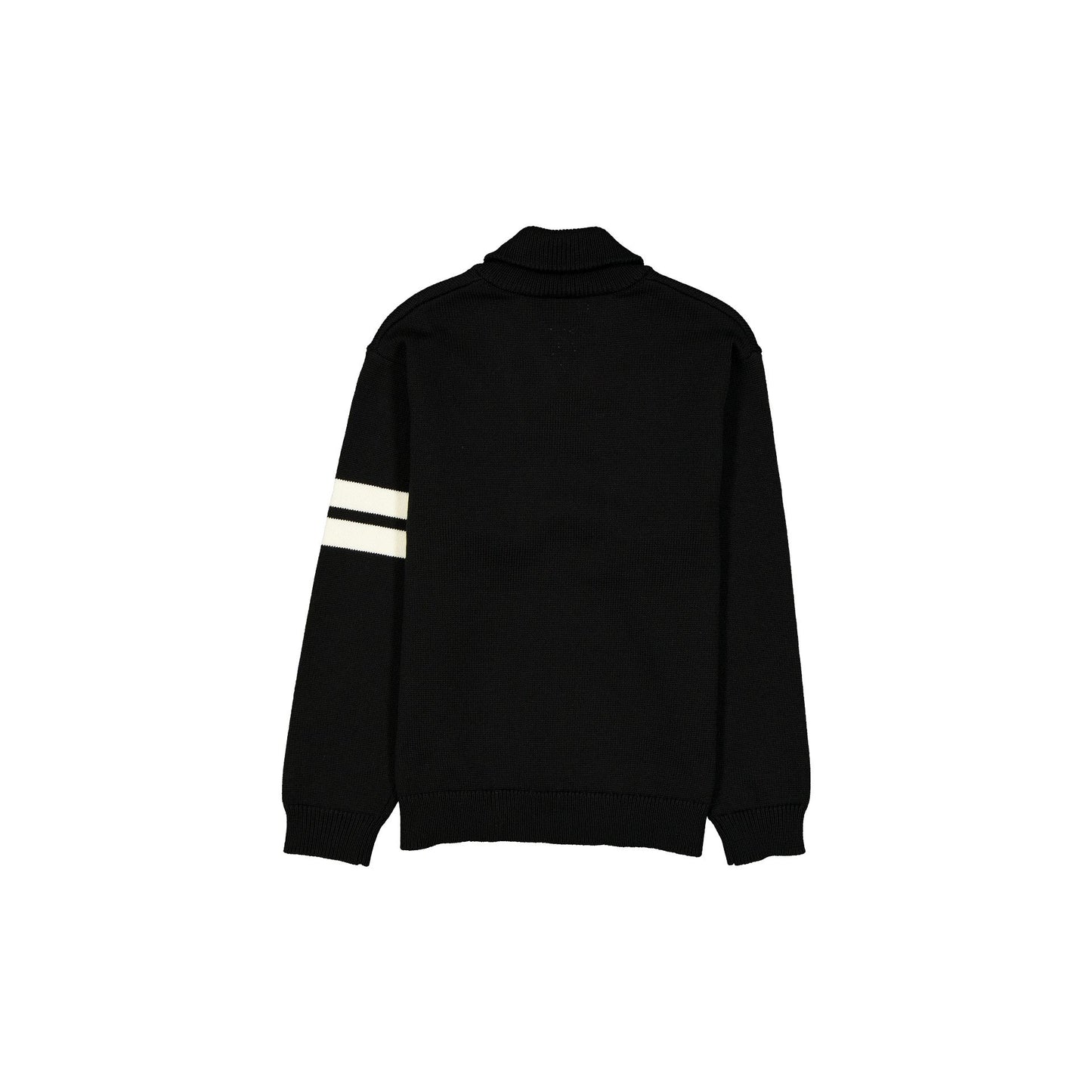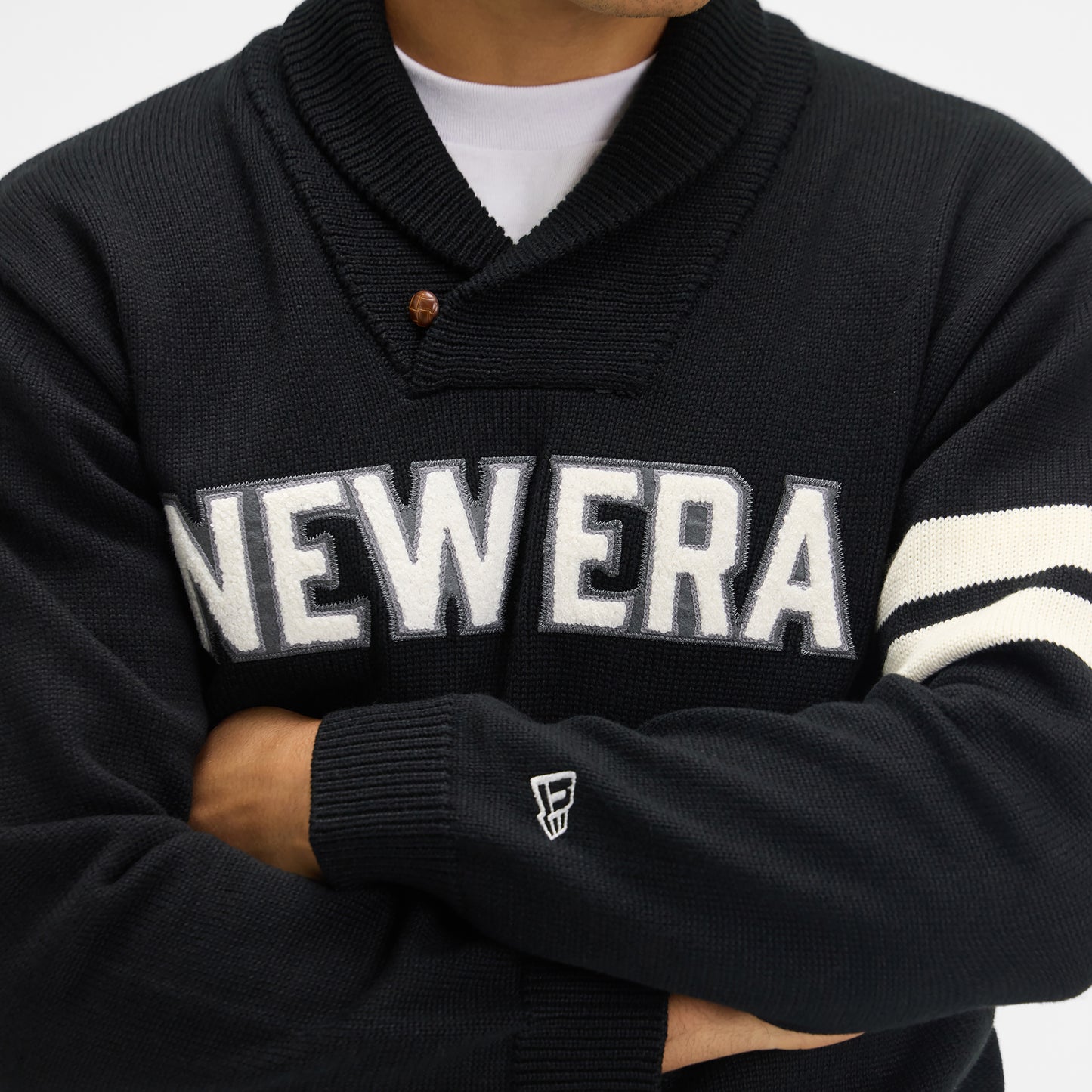 The New Era Cap Navy Shawl Sweater features an embroidered New Era applique wordmark at the front with a button at the collar and stripes at the sleeve.