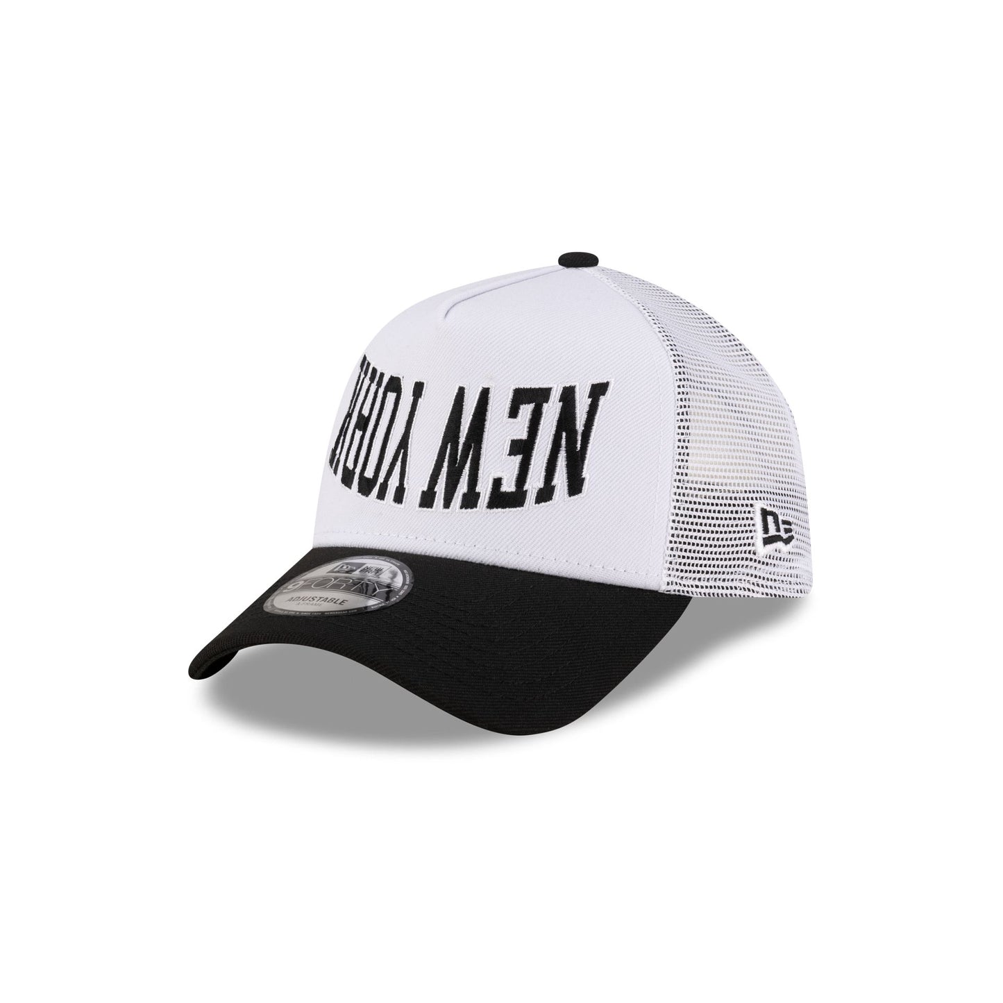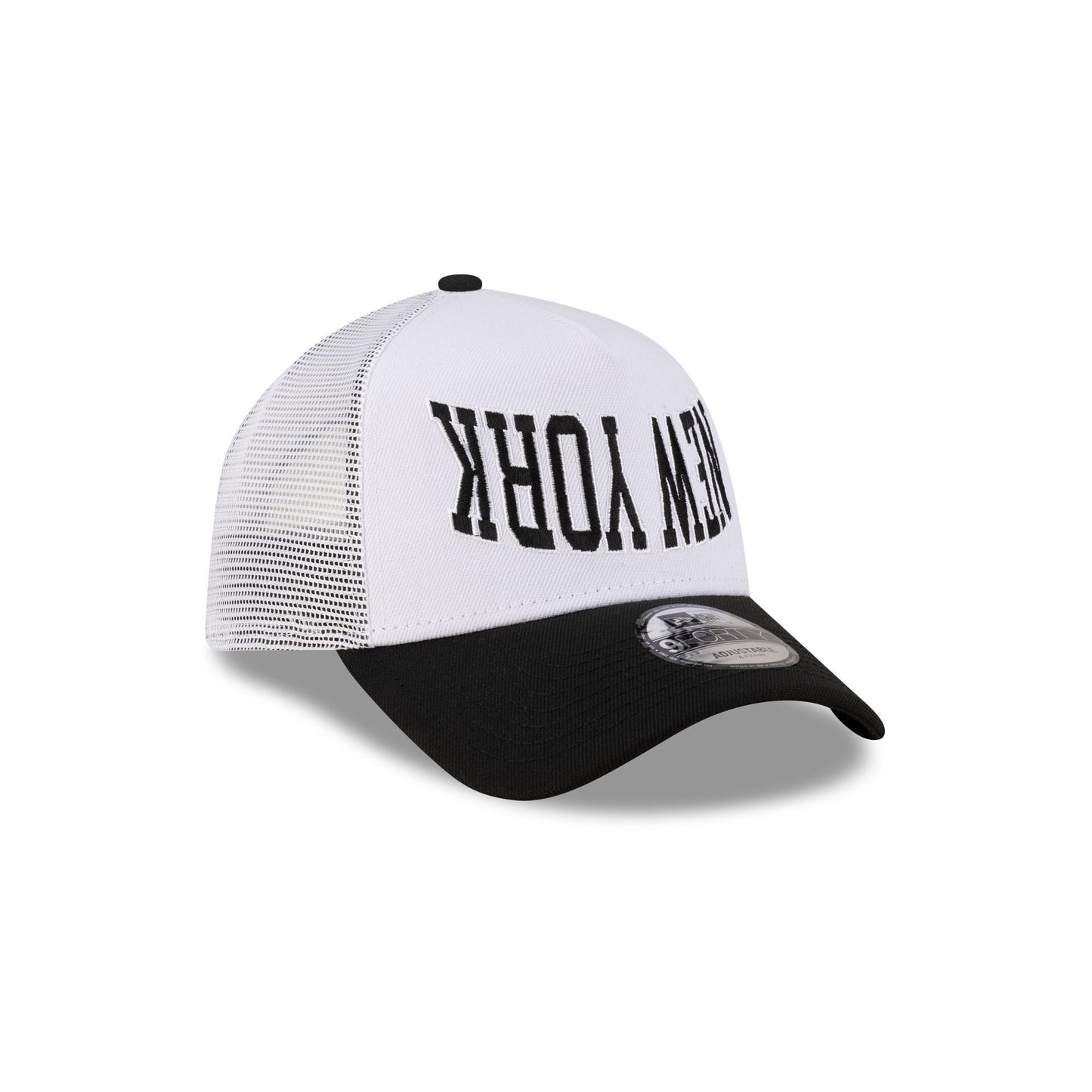 The New Era Cap New York 9FORTY A-Frame Trucker features an embroidered city wordmark at the front panels with a New Era Flag at the left-wear side, a snapback closure at the rear, and a black undervisor.