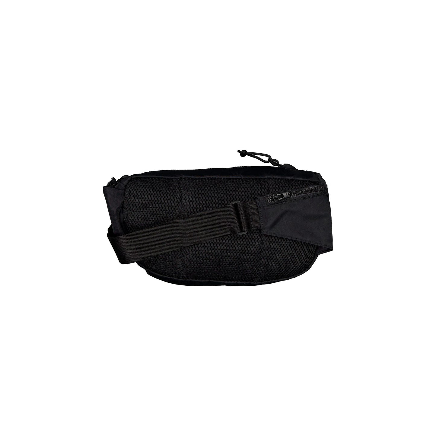 The New Era Cap Nylon Twill Black Explorer Waist Bag features a New Era patch at the front panels and embroidered New Era Flag at the left-wear side with a weather-resistant zip at the top pocket. Additional details include multiple pockets throughout the bag and an adjustable clip-back belt.