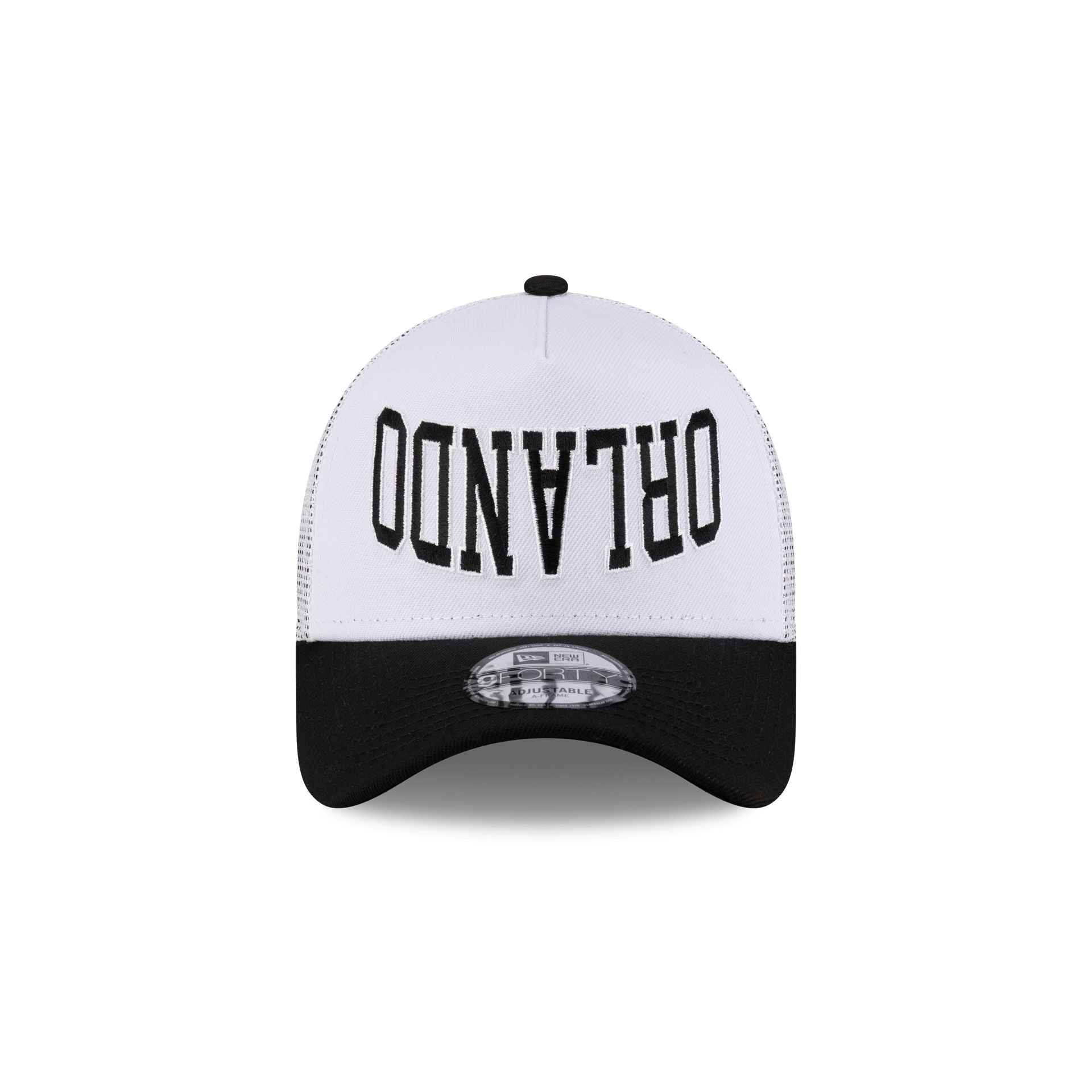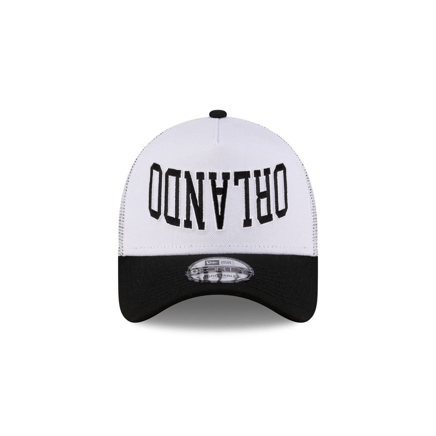 The New Era Cap Orlando 9FORTY A-Frame Trucker features an embroidered city wordmark at the front panels with a New Era Flag at the left-wear side, a snapback closure at the rear, and a black undervisor.