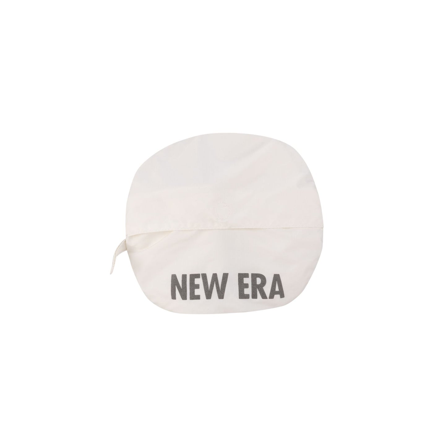The New Era Cap Packable Ripstop White Bucket Hat features an embroidered New Era Flag at the left-wear side and detachable strings. The bucket folds into a packable bag with a hook.