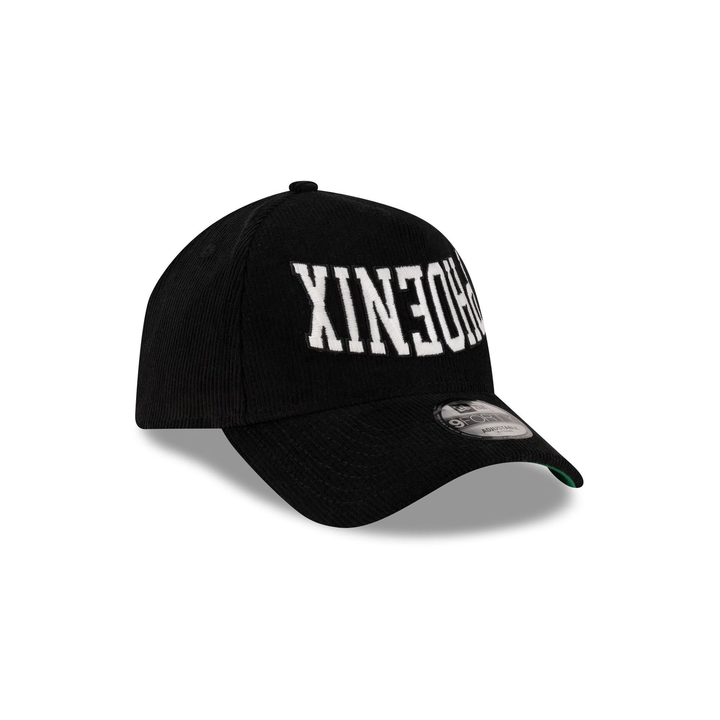 The New Era Cap Phoenix 9FORTY A-Frame Snapback features a glow-in-the-dark embroidered city wordmark at the front panels with a New Era Flag at the left-wear side, a snapback closure at the rear, and a green undervisor.