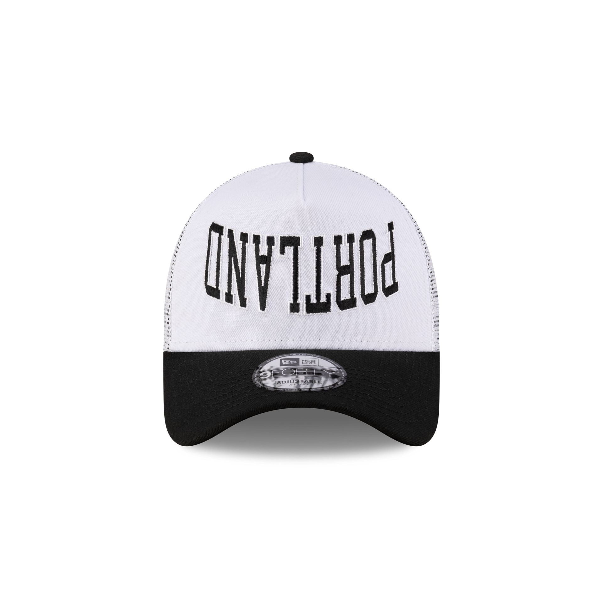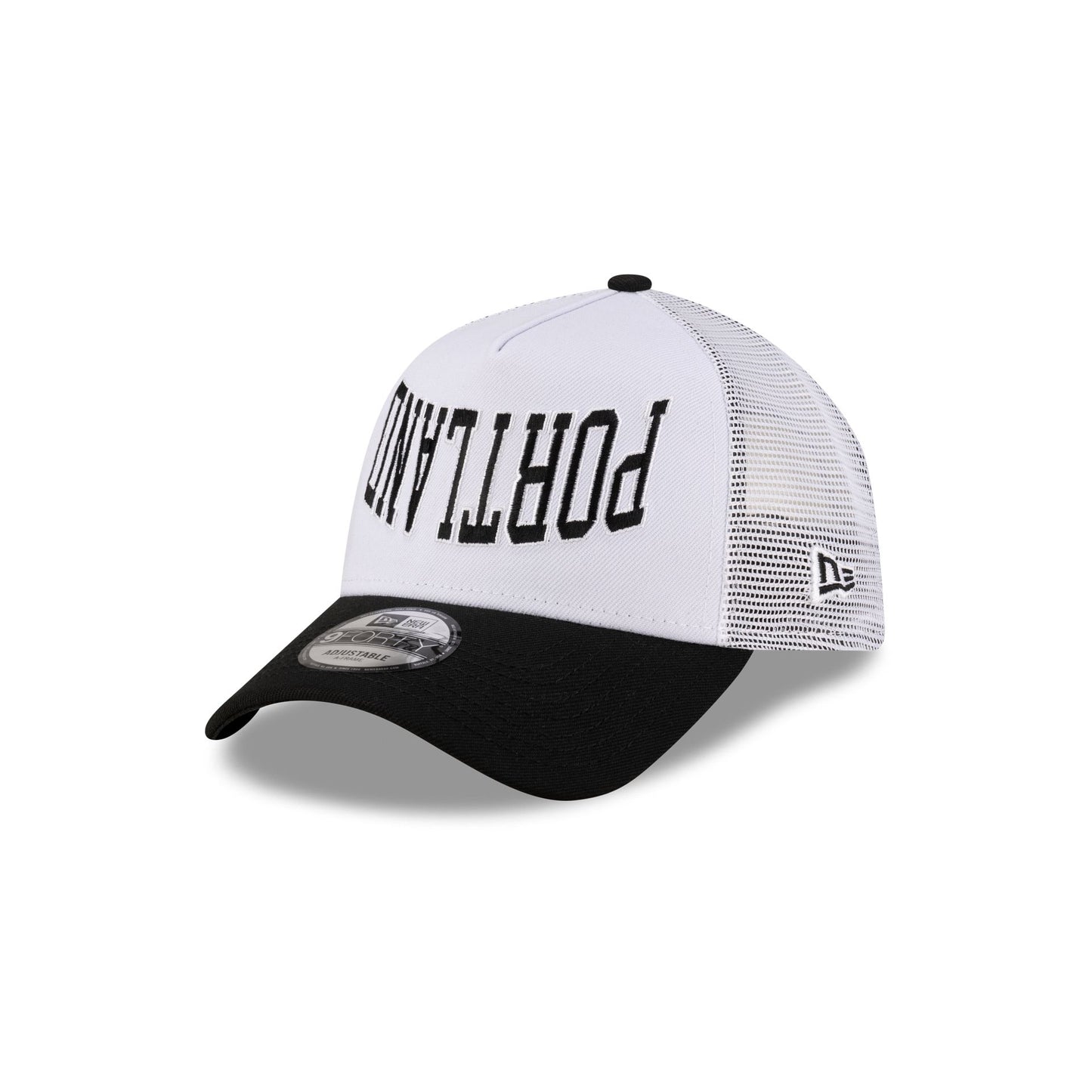 The New Era Cap Portland 9FORTY A-Frame Trucker features an embroidered city wordmark at the front panels with a New Era Flag at the left-wear side, a snapback closure at the rear, and a black undervisor.
