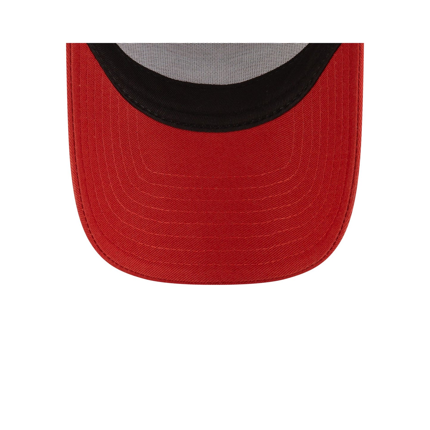 The New Era Cap Red Fishing 9FORTY A-Frame Trucker features an embroidered sport fishing patch at the front panels with a mesh back, a snapback closure at the rear, and a red undervisor.