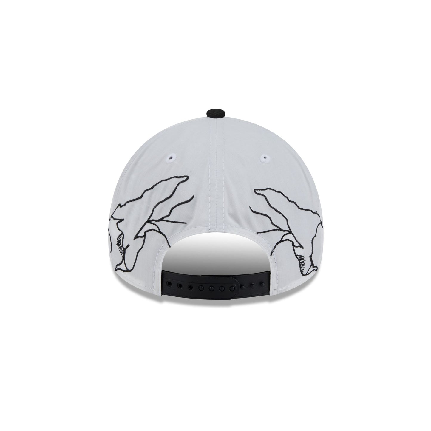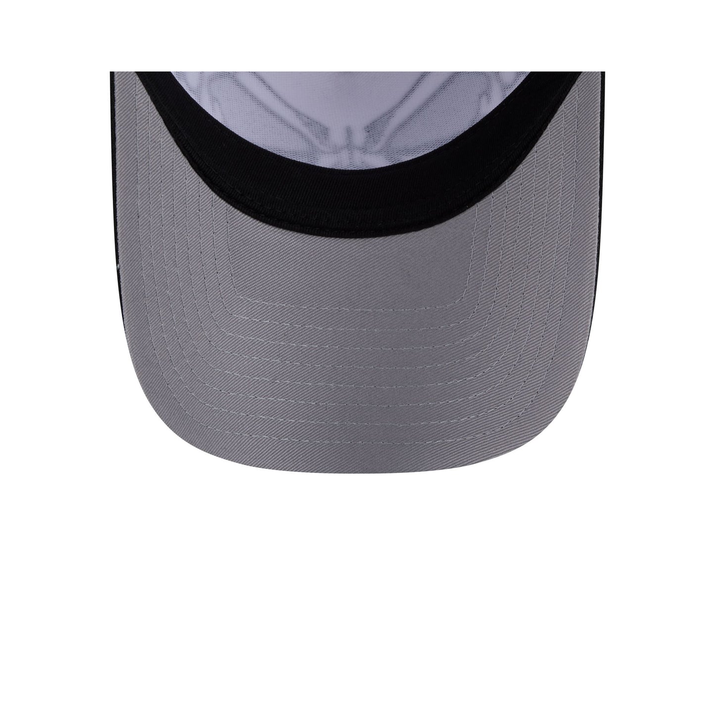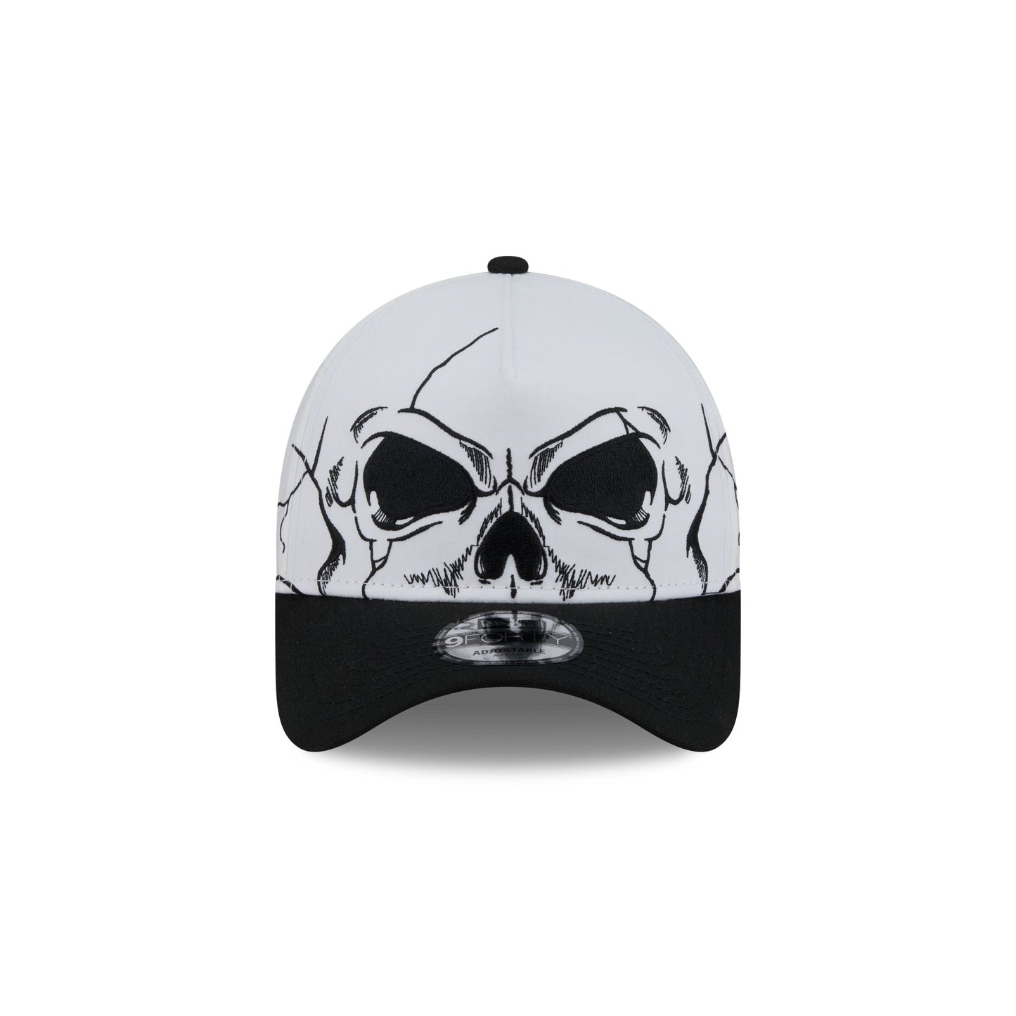 The New Era Cap Satin Skull 9FORTY A-Frame Snapback features a cracked skull crown with a New Era Flag at the left-wear side, a snapback closure at the rear, and a black visor.