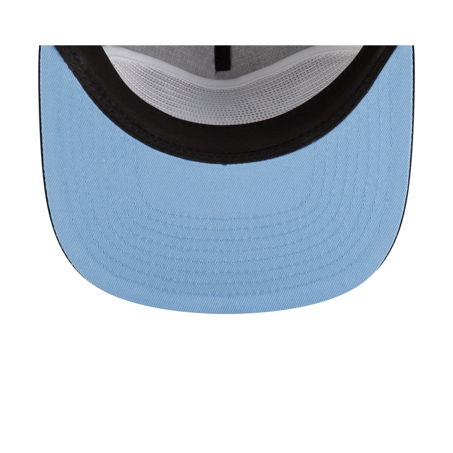 The New Era Cap Sinbin Golfer Hat features an embroidered Sinbin script at the front panels with a Buffalo patch at the right-wear side and a blue undervisor.
