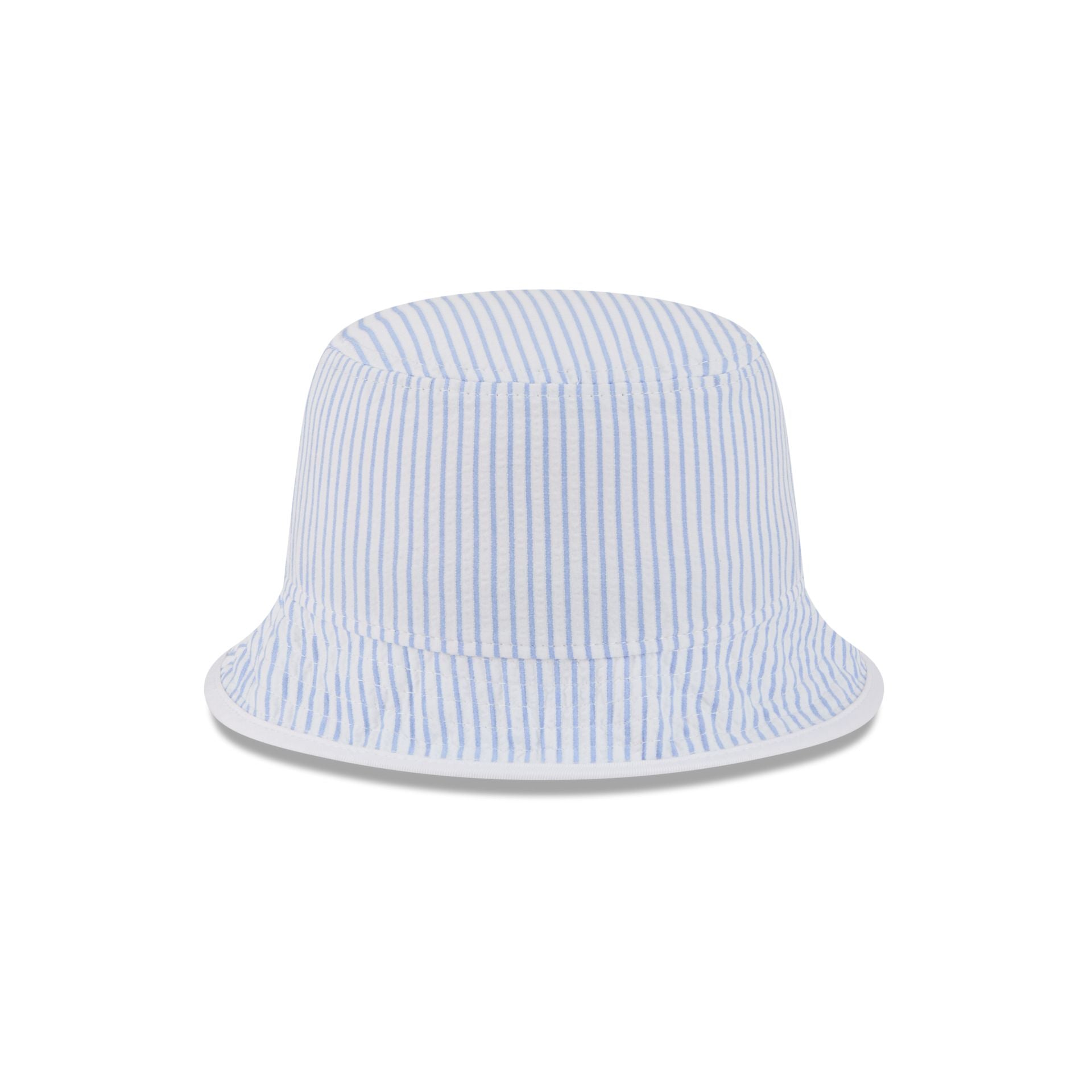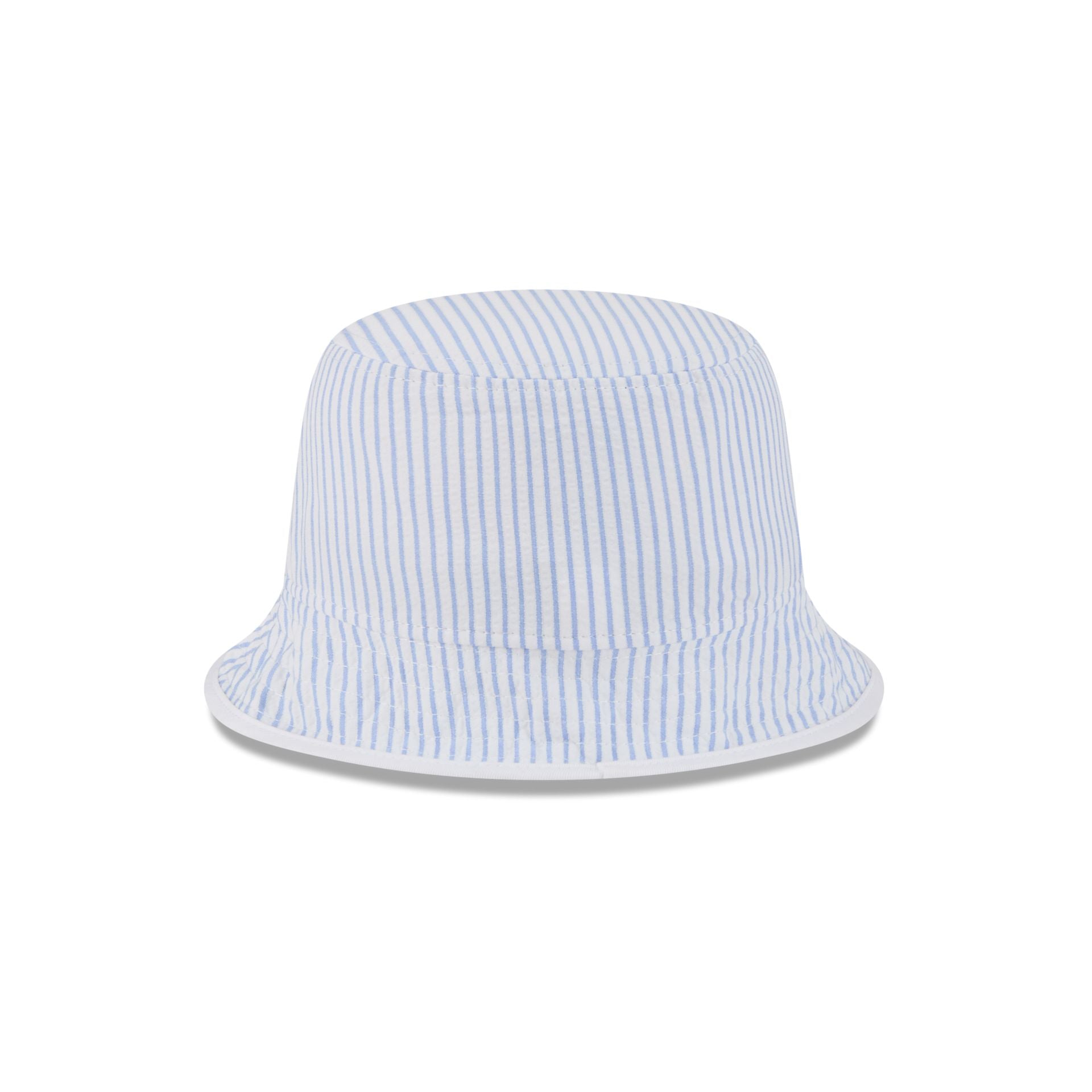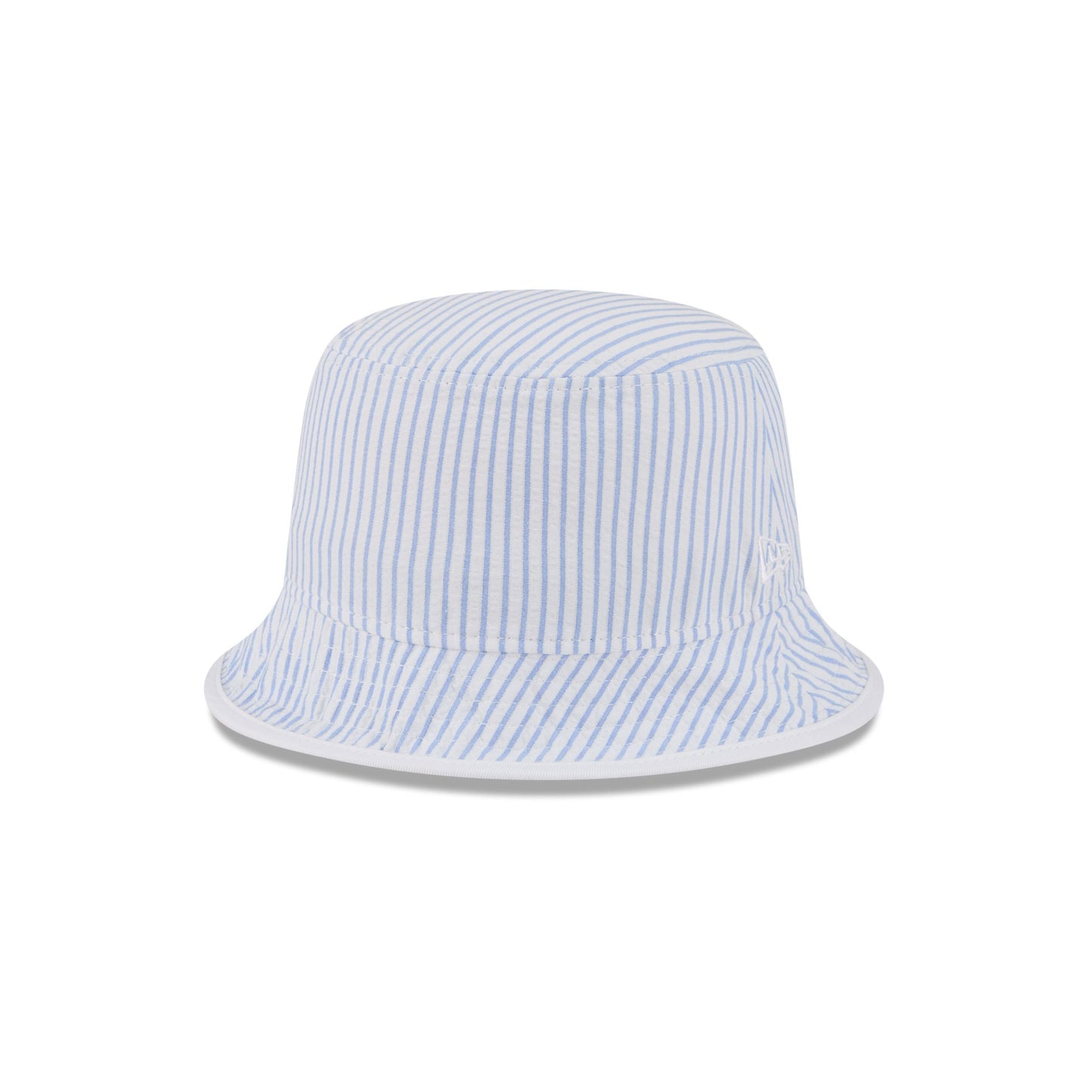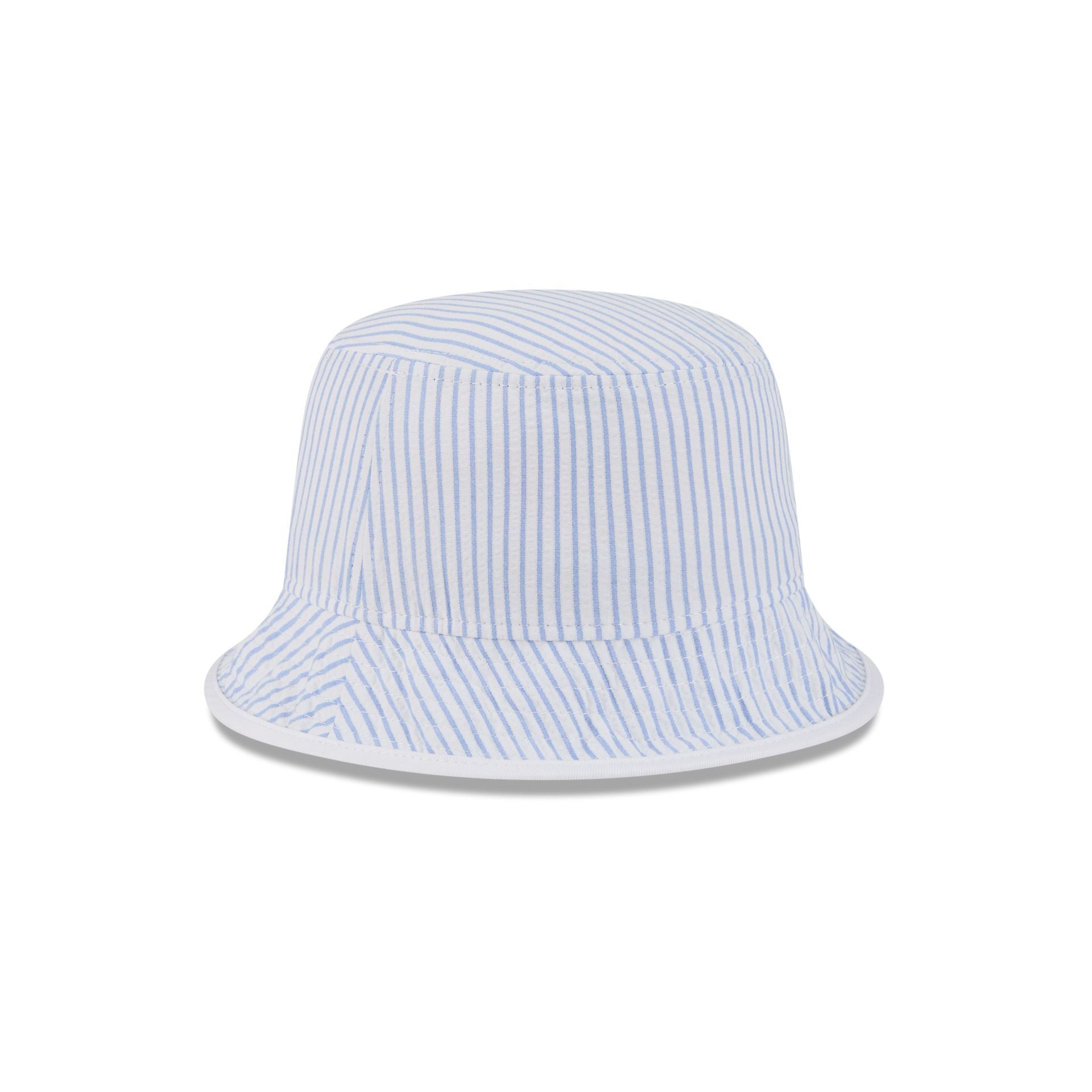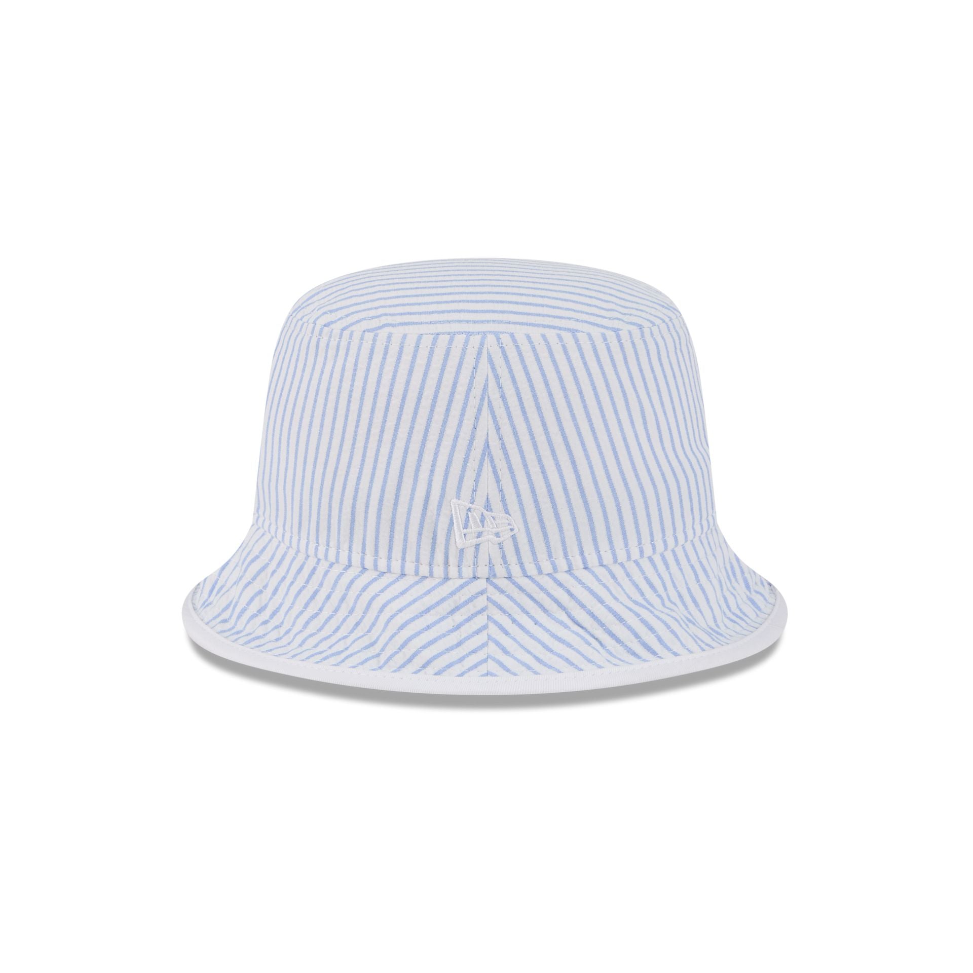 The Sky Blue Pinstripe Bucket Hat features a pinstripe fabrication throughout with a New Era Flag at the left-wear side.