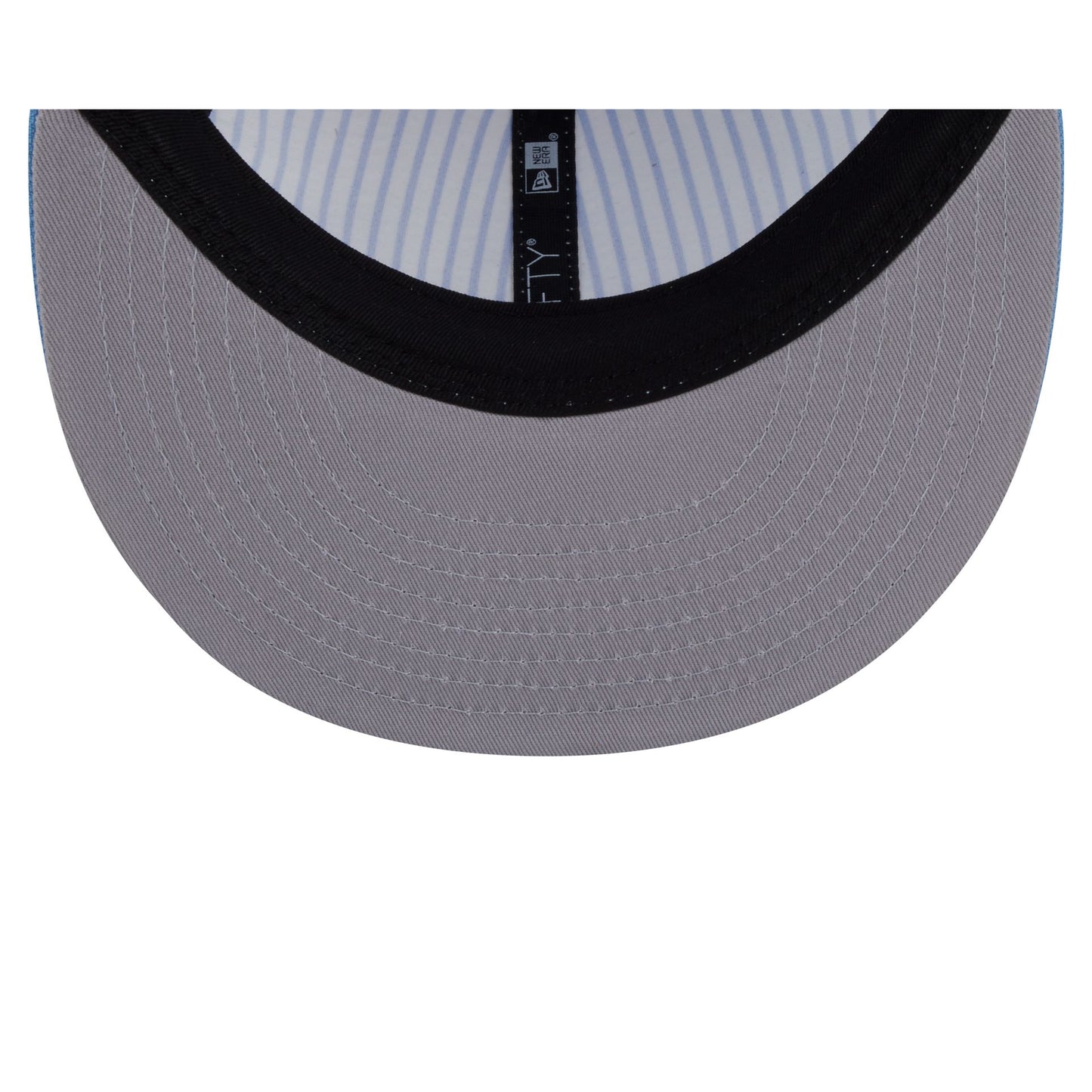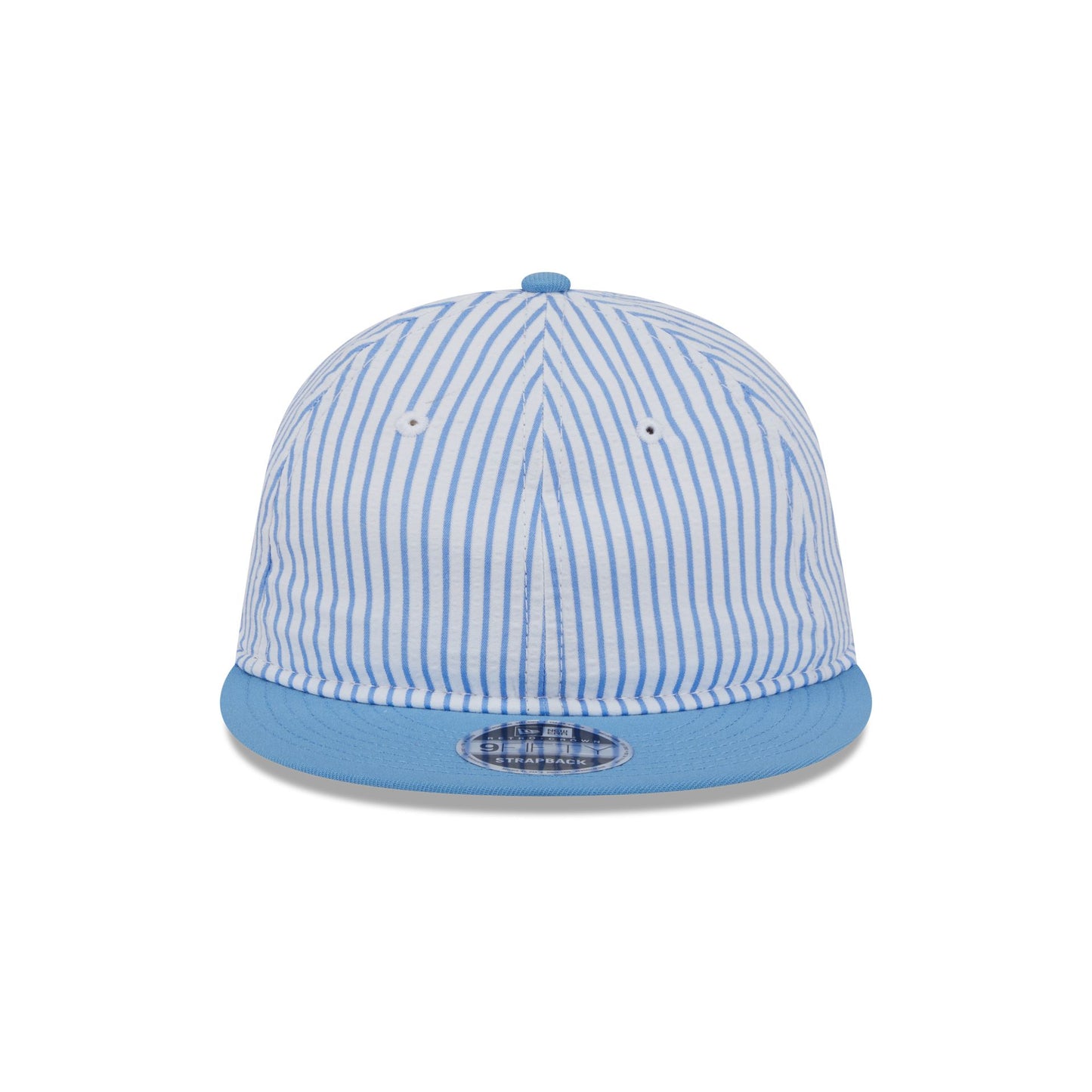 The Sky Blue Pinstripe Retro Crown 9FIFTY Snapback features a pinstripe fabrication throughout with a New Era Flag at the left-wear side and an adjustable snapback closure at the rear.