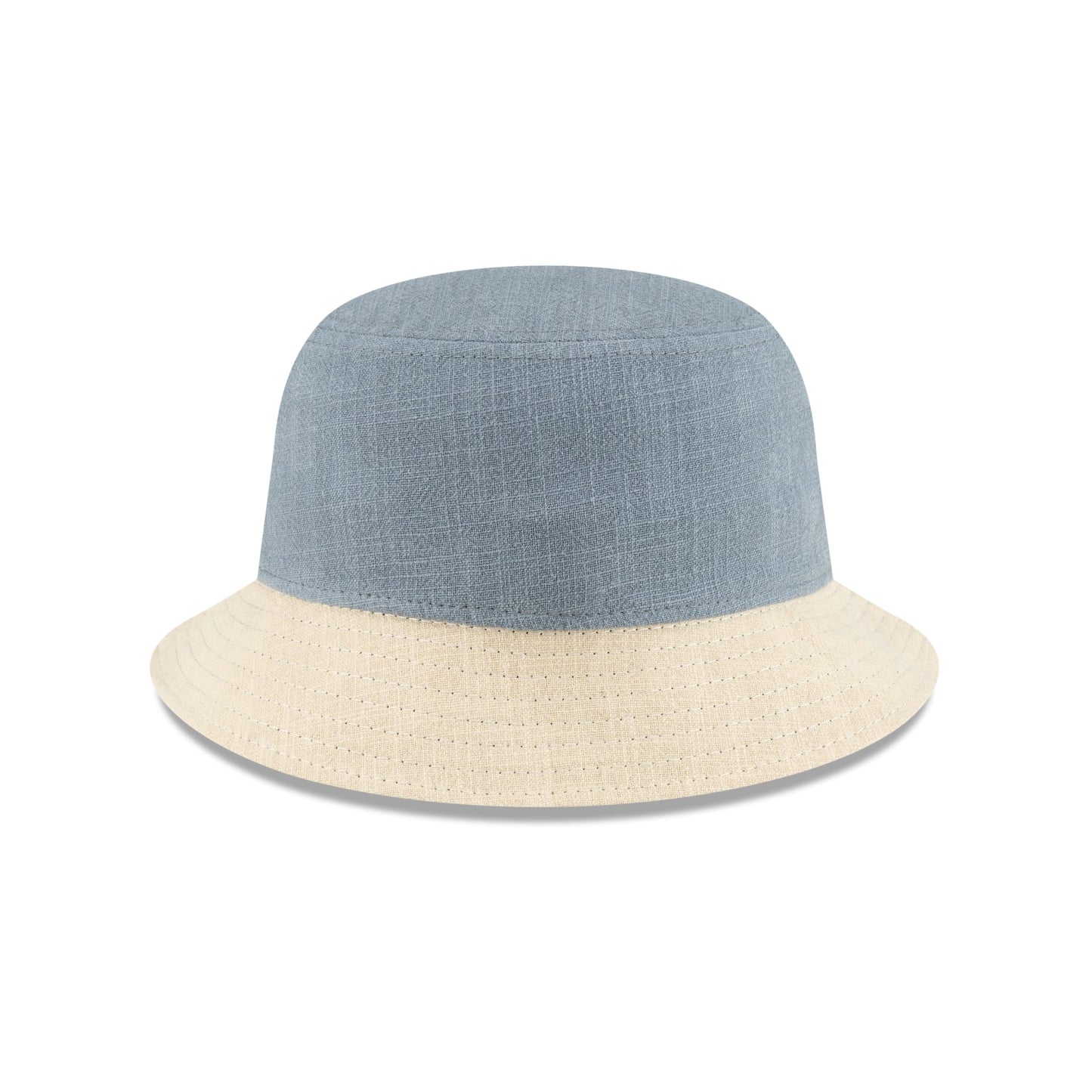 The New Era Cap Soft Linen Slate Bucket Hat features an embroidered New Era wordmark at the front with a stone brim and black underbrim.
