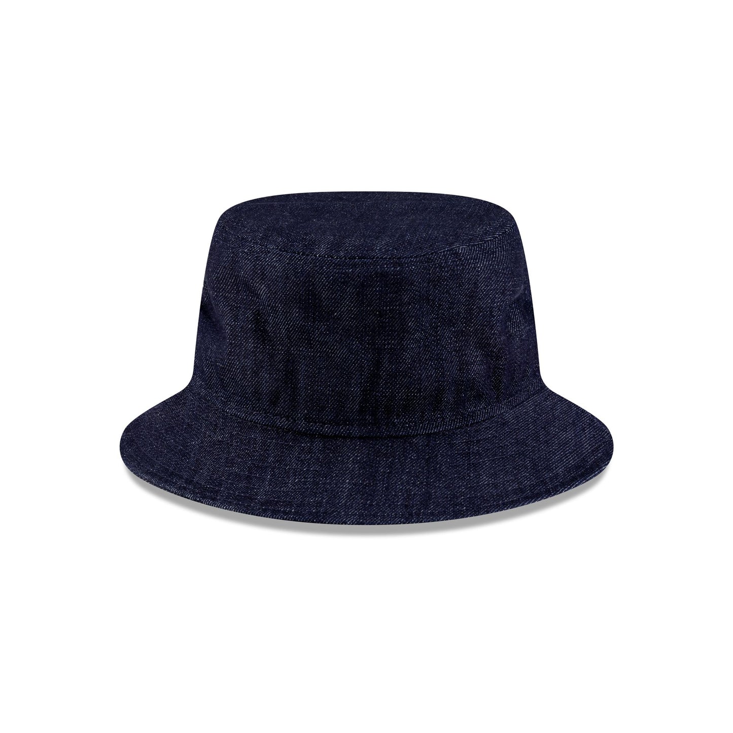 The New Era Cap Square Logo Light Denim Bucket Hat features an embroidered New Era logo at the front with a New Era Flag at the left-wear side.
