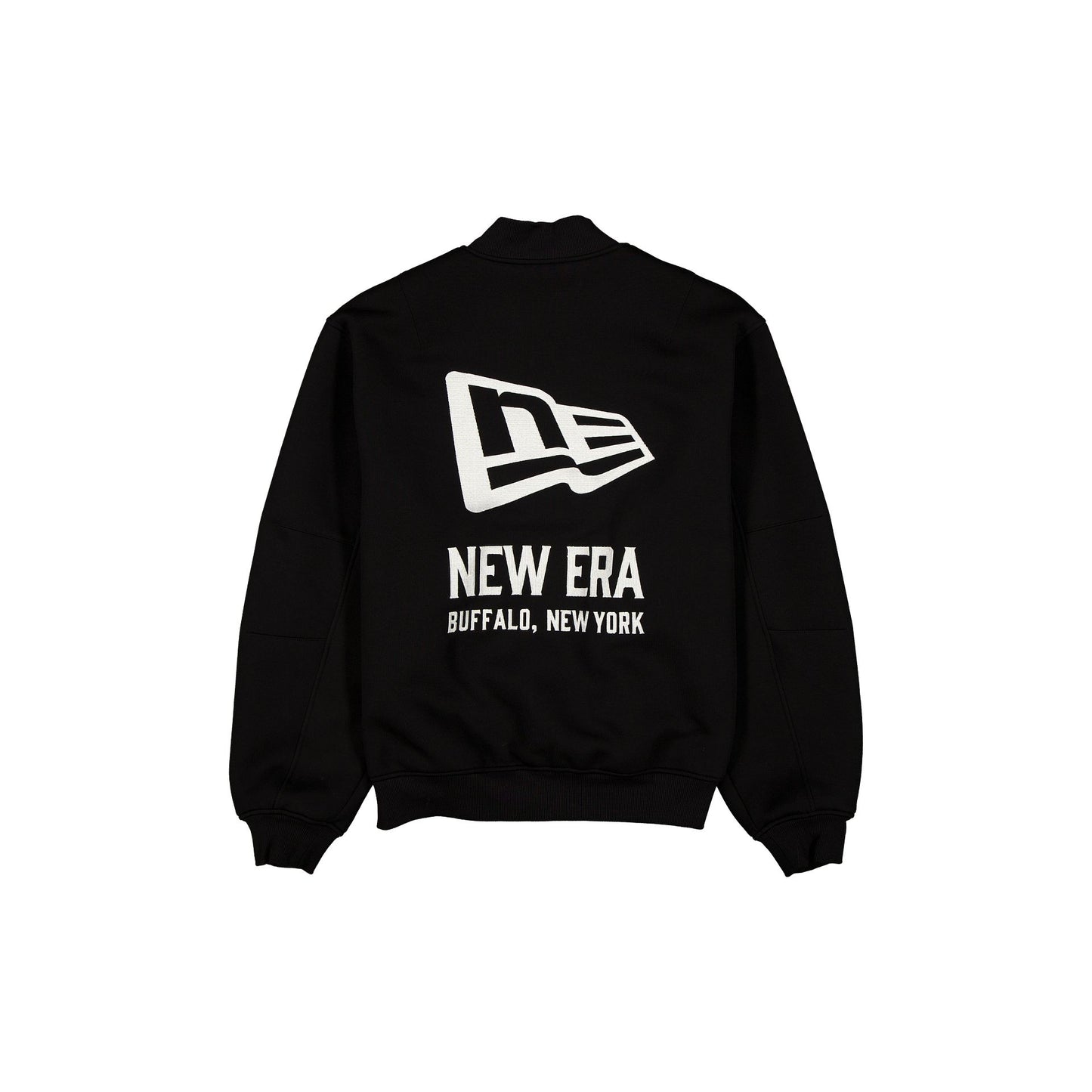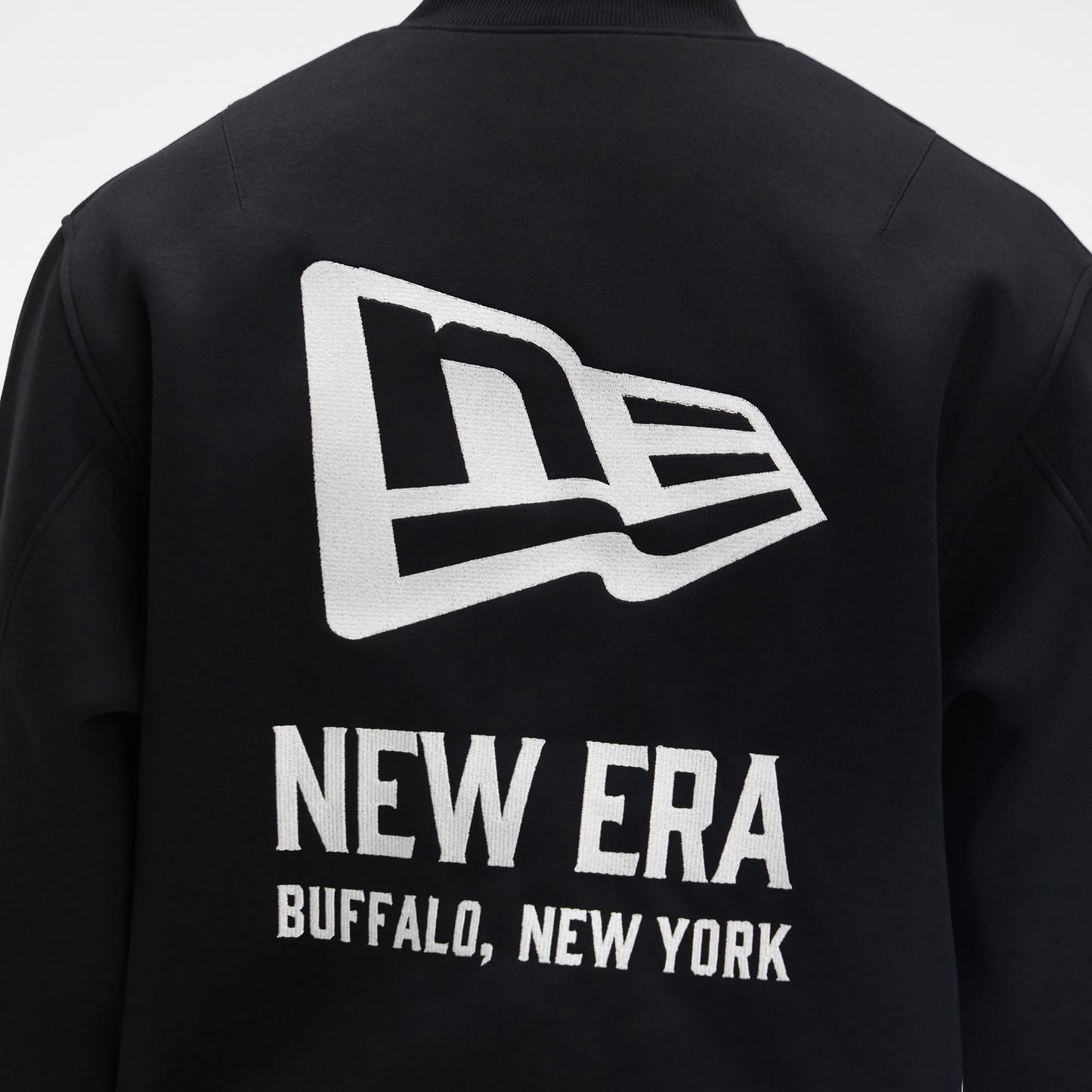 The New Era Cap Tech Sweat Black Varsity Jacket features an embroidered New Era vertical wordmark at the left side and a stitched logo and wordmark at the rear. Additional details include a snap button closure and a satin interior.