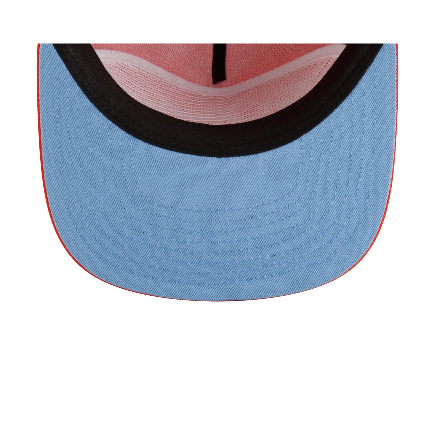 The New Era Cap Top Cheddar Golfer Hat features an embroidered Top Cheddar script at the front panels with a Buffalo patch at the right-wear side and a blue undervisor.
