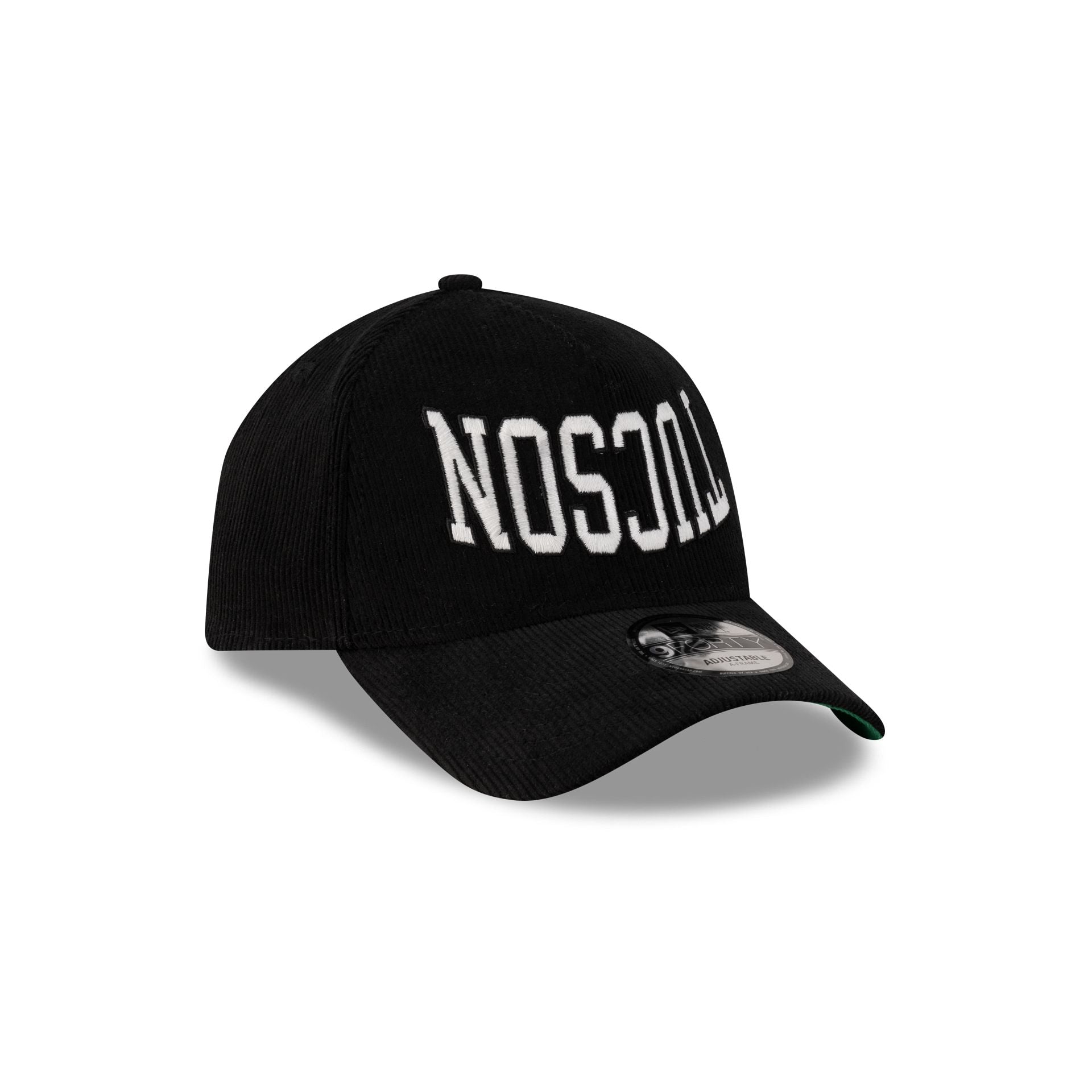 The New Era Cap Tucson 9FORTY A-Frame Snapback features a glow-in-the-dark embroidered city wordmark at the front panels with a New Era Flag at the left-wear side, a snapback closure at the rear, and a green undervisor.