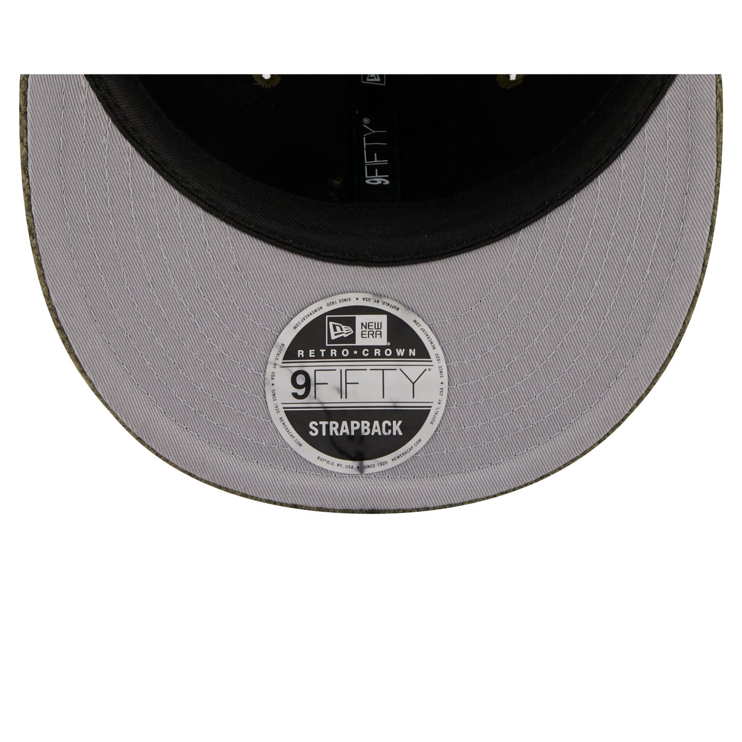The New Era Cap Waffle Knit Olive Retro Crown 9FIFTY Strapback Cap features an embroidered New Era Flag at the left-wear side with a waffle knit fabrication, a gray undervisor, and an adjustable strapback closure at the rear.