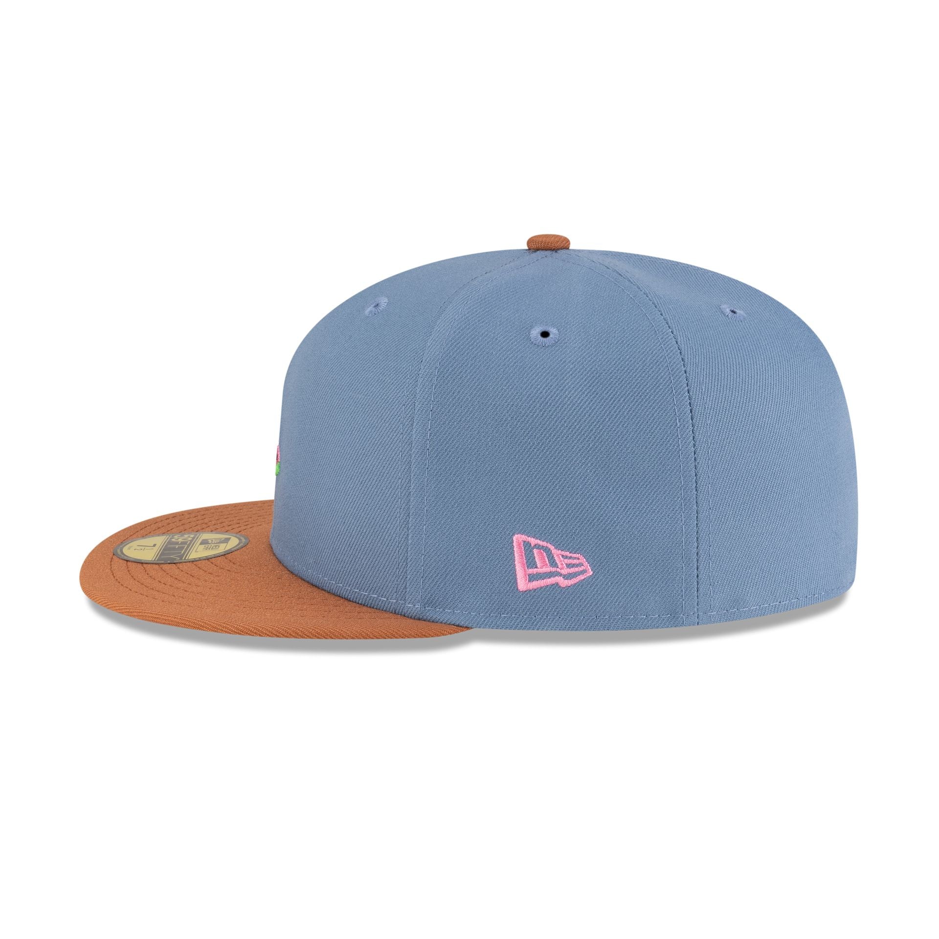 The New Era Cap Watermelon 59FIFTY Fitted Cap features an embroidered watermelon slice icon at the front panels with New Era Flag at the left-wear side, a brown visor, and a gray undervisor.