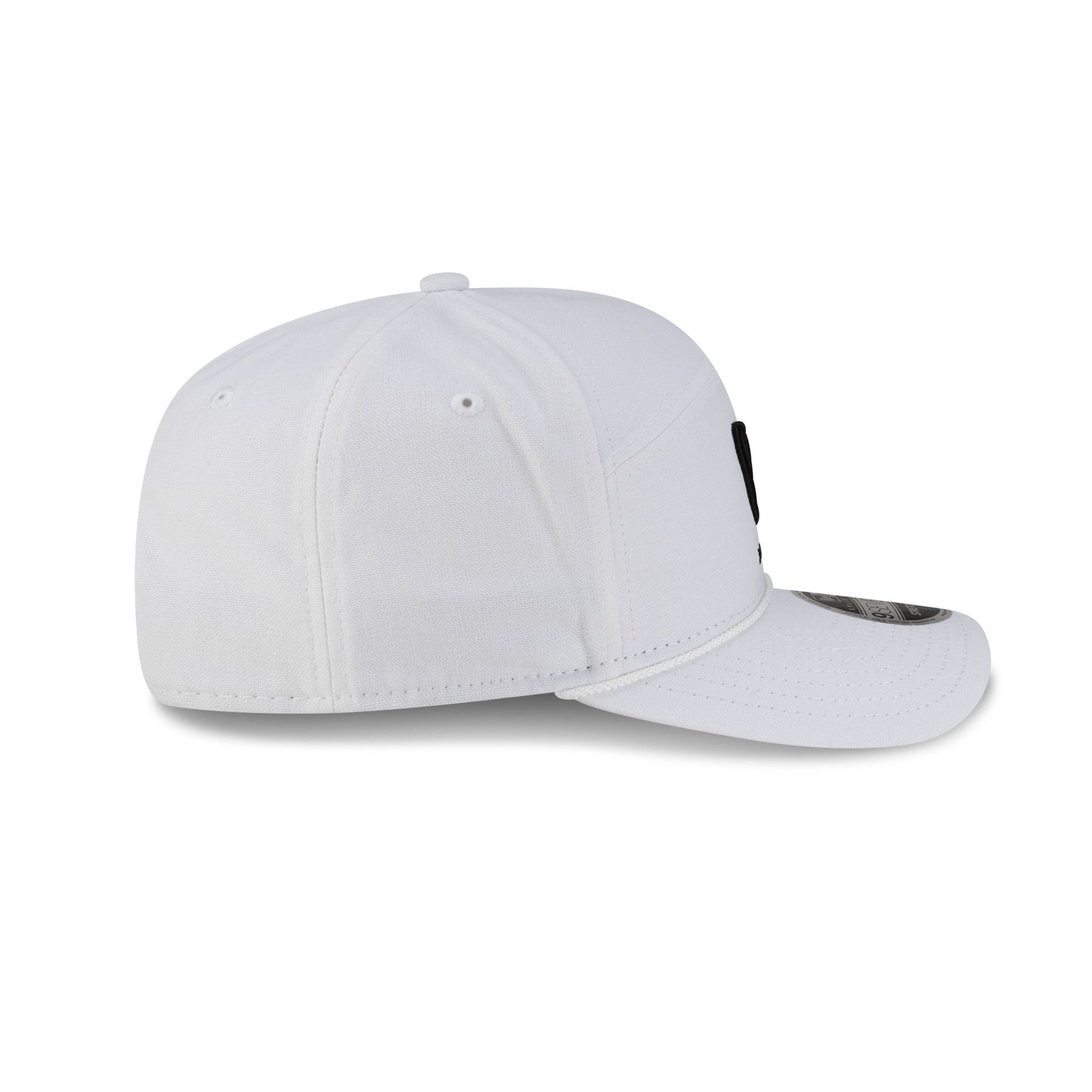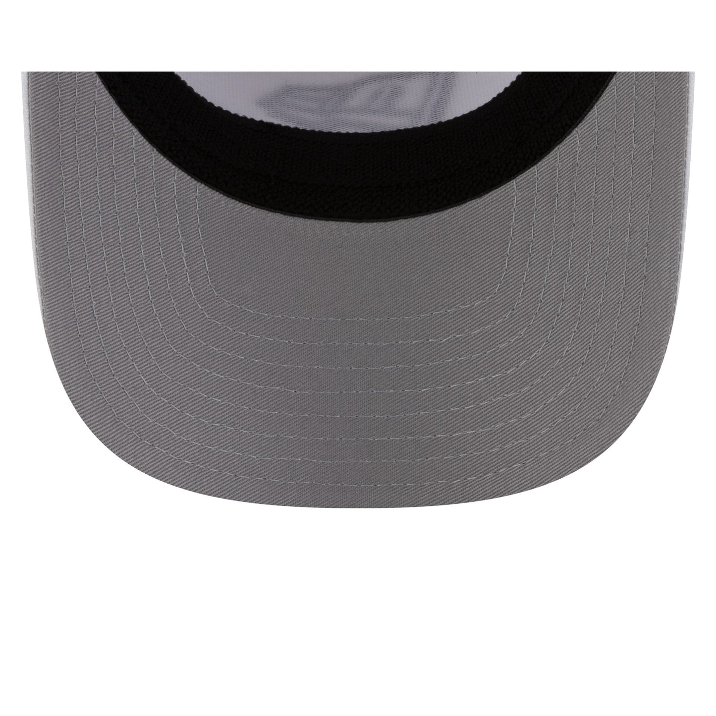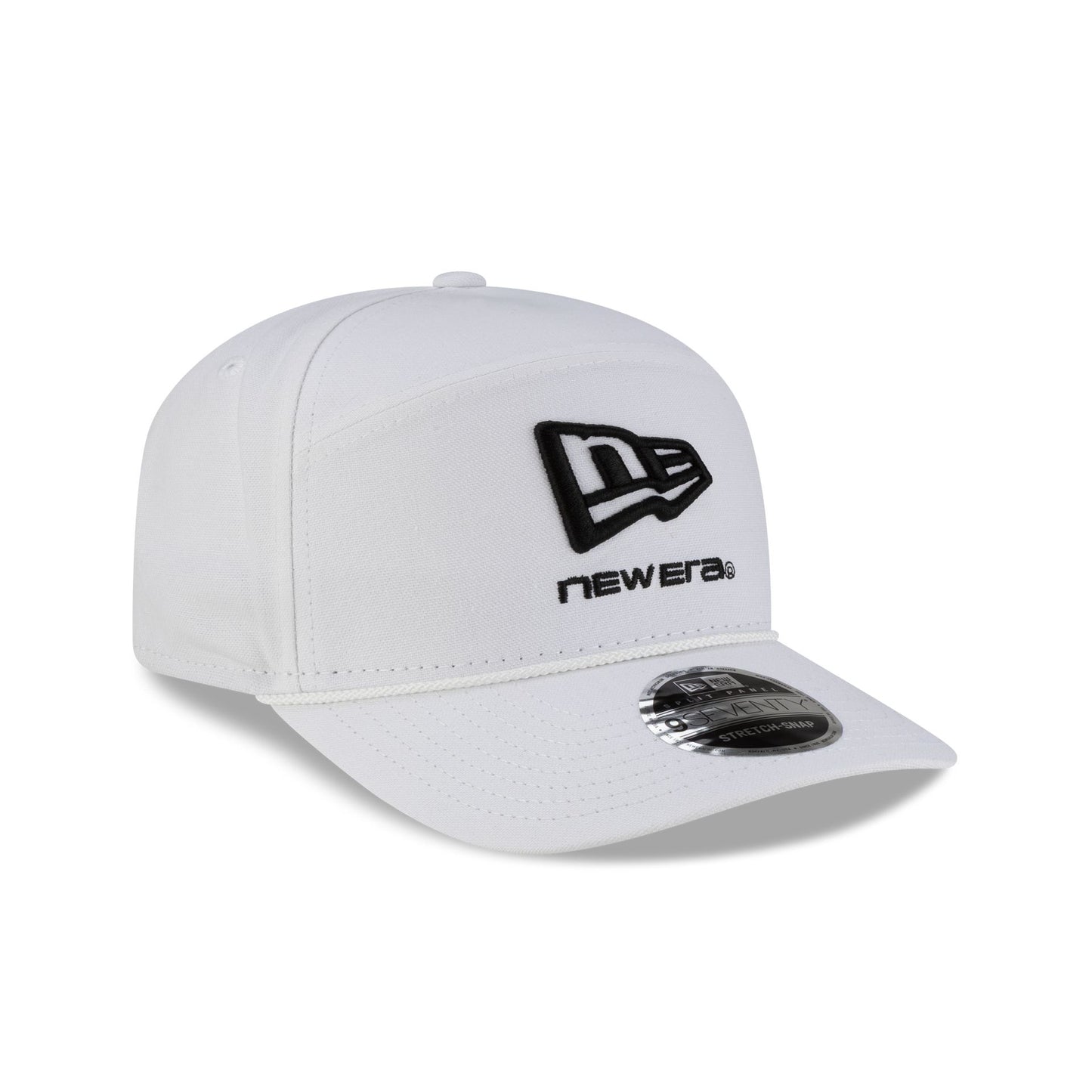 The New Era Cap White Split Panel 9SEVENTY Stretch-Snap features an embroidered New Era Flag and wordmark at the front panel with an adjustable snapback closure at the rear, a pre-curved visor, and a gray undervisor.
