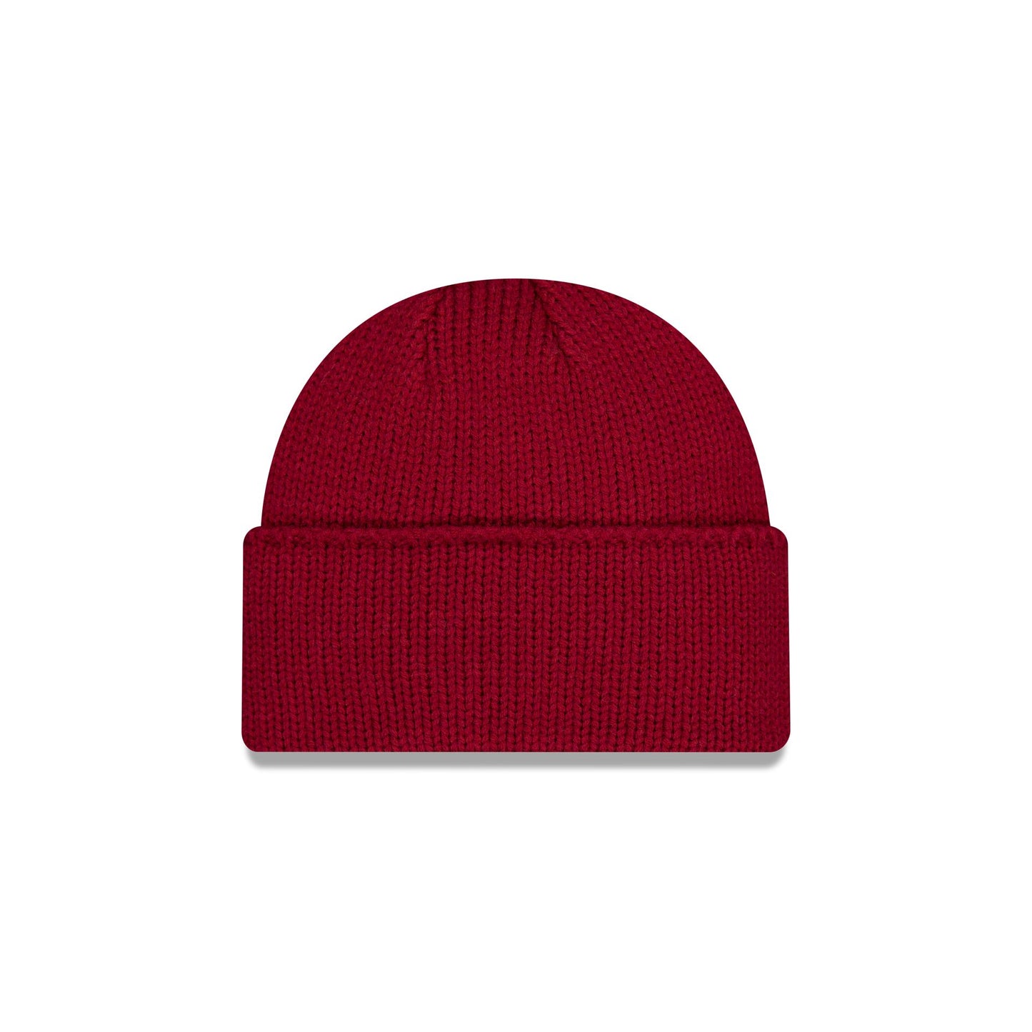 The New Era Dark Red Wide Cuff Knit Beanie features a metal New Era logo at the front with an embroidered New Era Flag at the left-wear side.