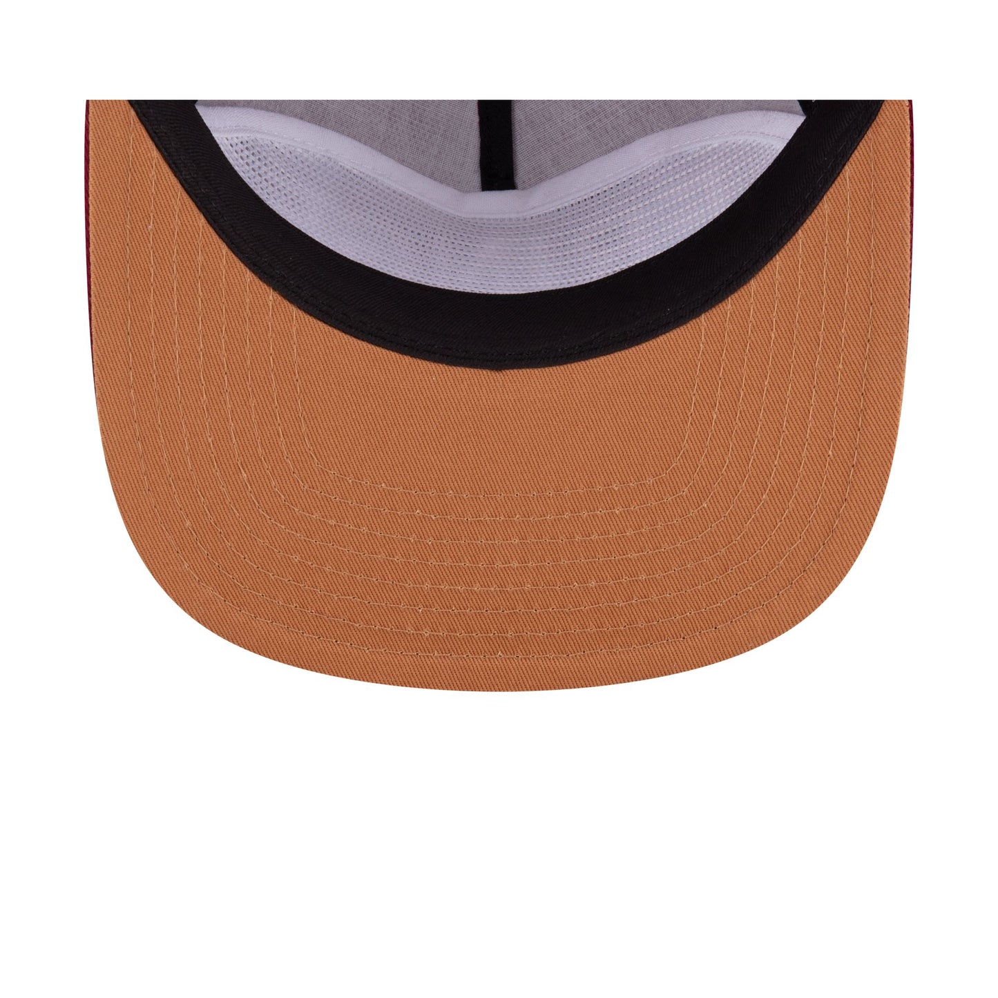 The New Era Golf Fringe Golfer features an embroidered Fringe wordmark at the front panels with a New Era Golf logo above a snapback closure at the rear and a brown undervisor.