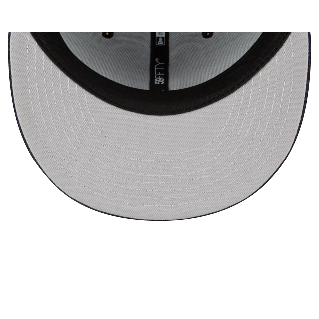 The New Era Golf Navy 59FIFTY Fitted Cap features an embroidered New Era Golf logo at the front panels with a corresponding wordmark at the rear and a gray undervisor.
