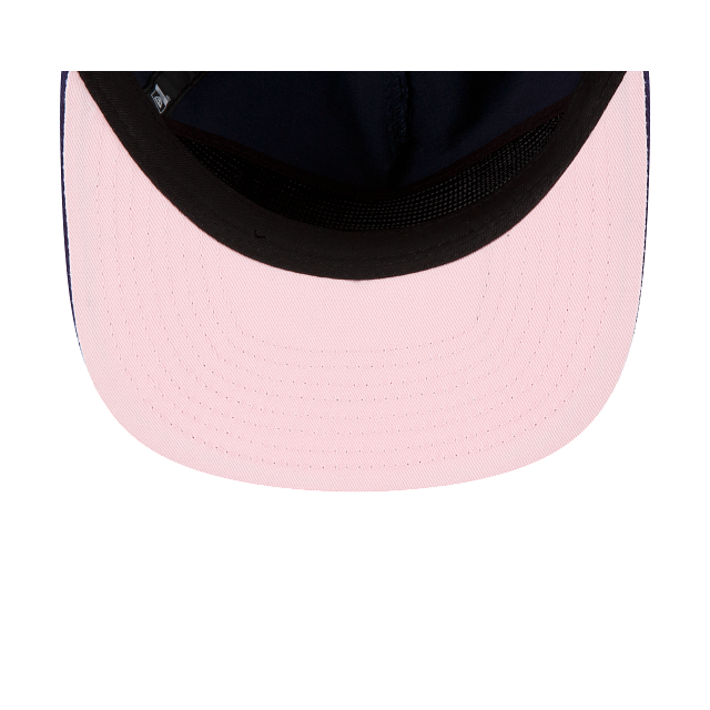 The New Era Golf Navy Golfer features an embroidered golf text at the front panels with a New Era Golf logo above a snapback closure at the rear and a pink undervisor.