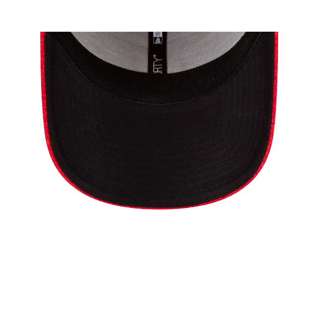 The New Era Golf Red 9FORTY Stretch Snap Cap features an embroidered New Era Golf logo at the front panels with a corresponding wordmark above a snapback closure at the rear and black undervisor.