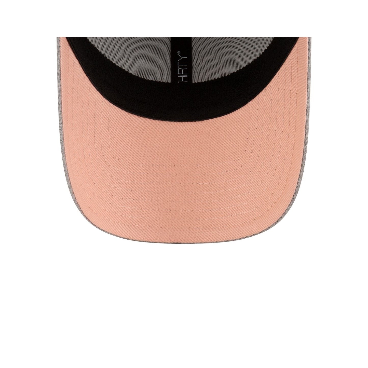The New Era Golf Script Gray 39THIRTY Stretch Fit Cap features an embroidered New Era Golf wordmark at the front panels with a New Era Golf logo at the rear and a peach undervisor.