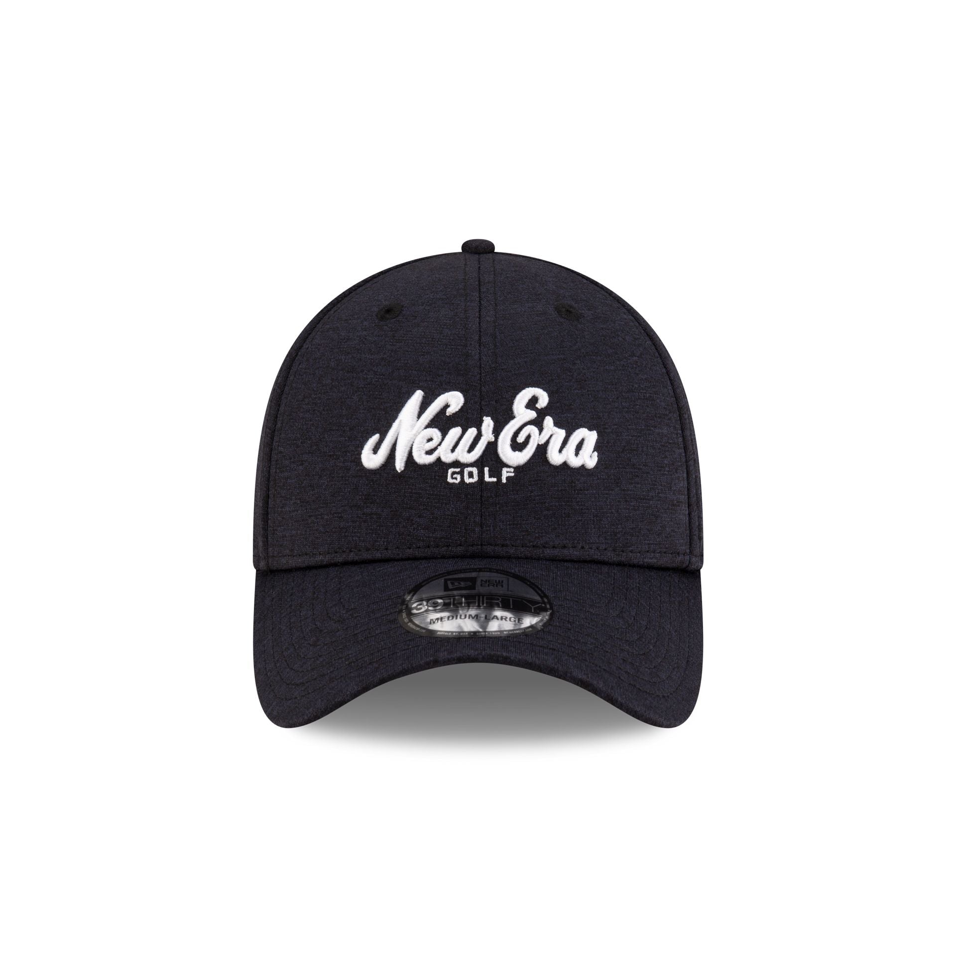 The New Era Golf Script Navy 39THIRTY Stretch Fit Cap features an embroidered New Era Golf wordmark at the front panels with a New Era Golf logo at the rear and a gray undervisor.