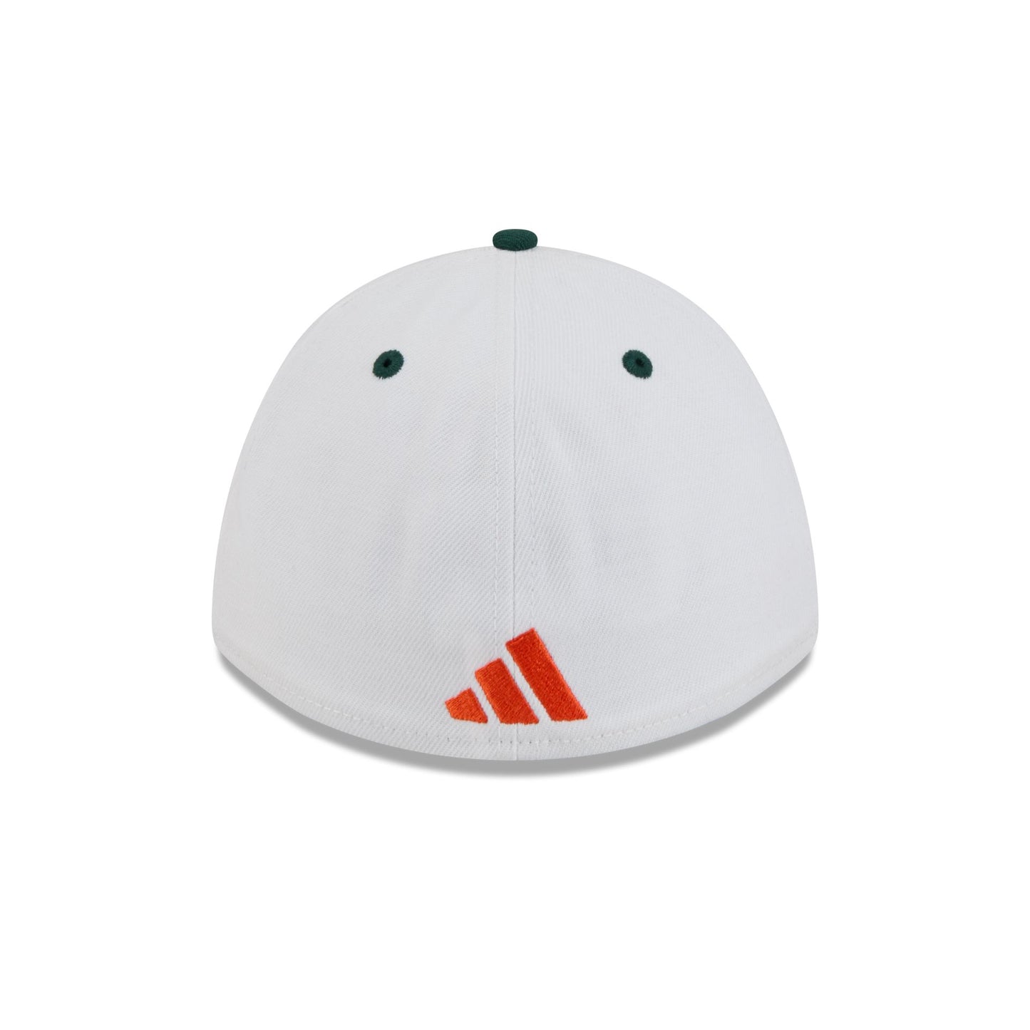 The New Era x adidas Miami Hurricanes White 39THIRTY M-Crown Stretch Fit features an embroidered Hurricanes logo at the front panels with the adidas logo at the rear and a gray undervisor.