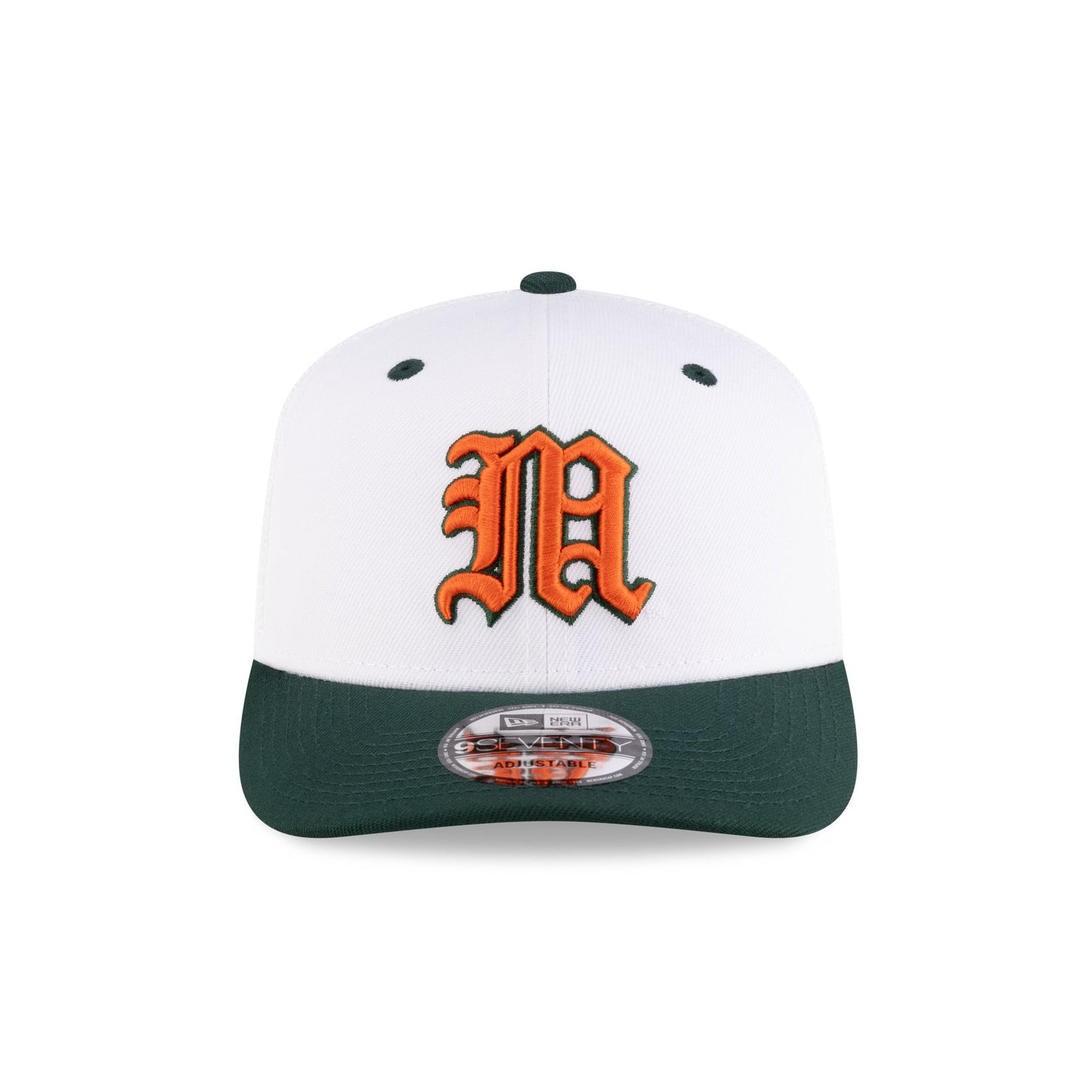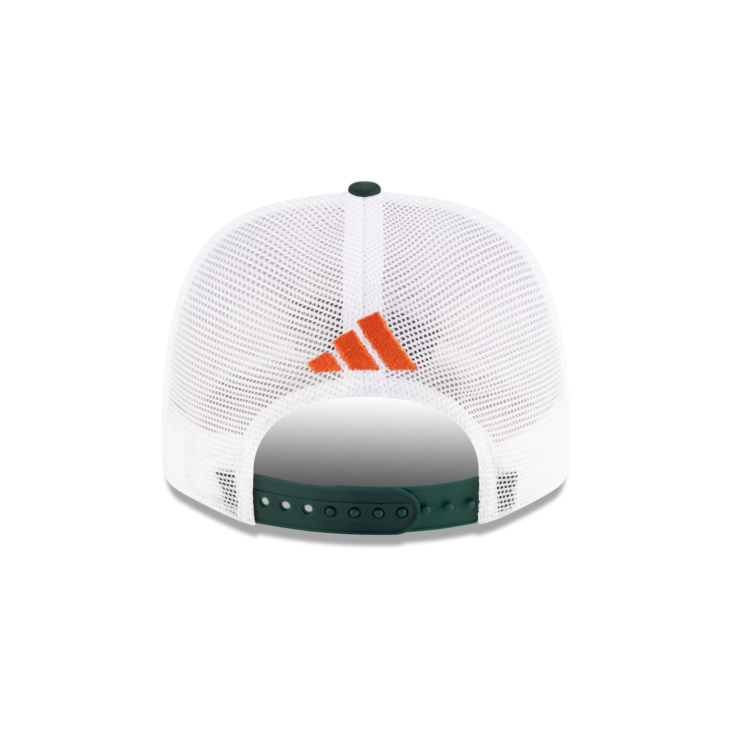 The Official On-Field cap for Miami Hurricanes baseball, the White 9SEVENTY Trucker features an embroidered Hurricanes logo at the front panels with the adidas logo above a snapback closure at a mesh rear and a gray undervisor.