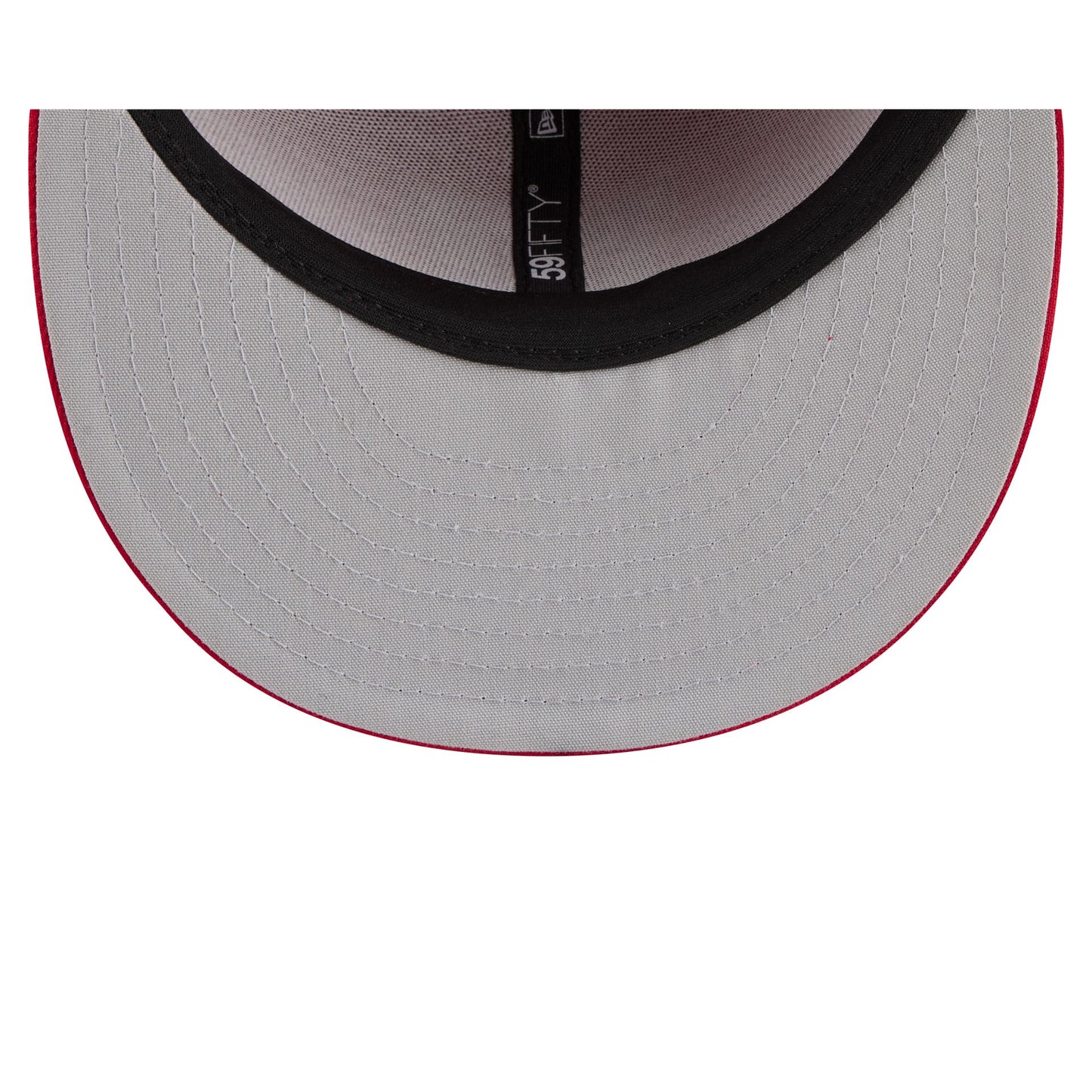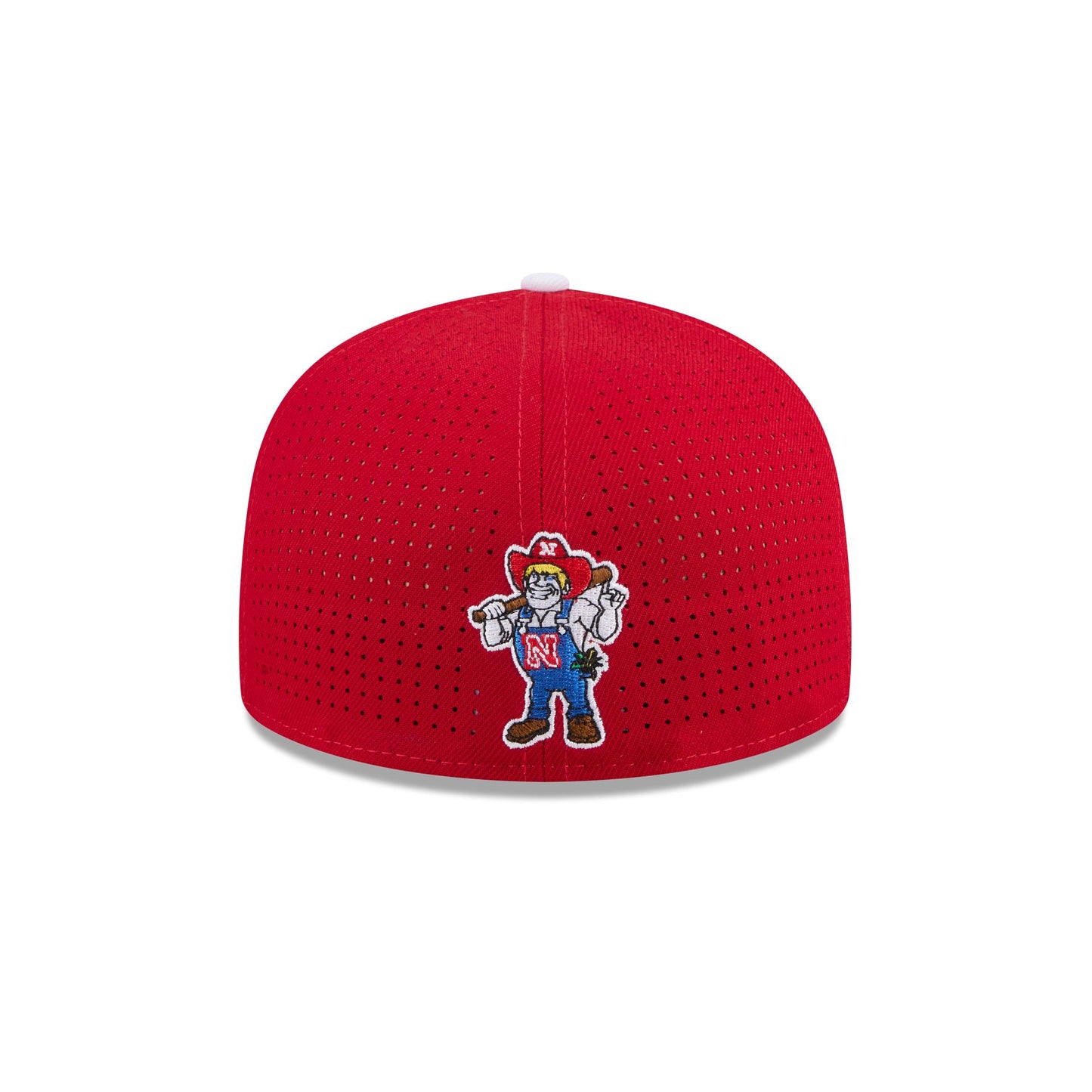 The New Era x adidas Nebraska Cornhuskers Scarlet 59FIFTY Fitted Cap features an embroidered Cornhuskers logo at the front panels with a team graphic at the rear and a gray undervisor.