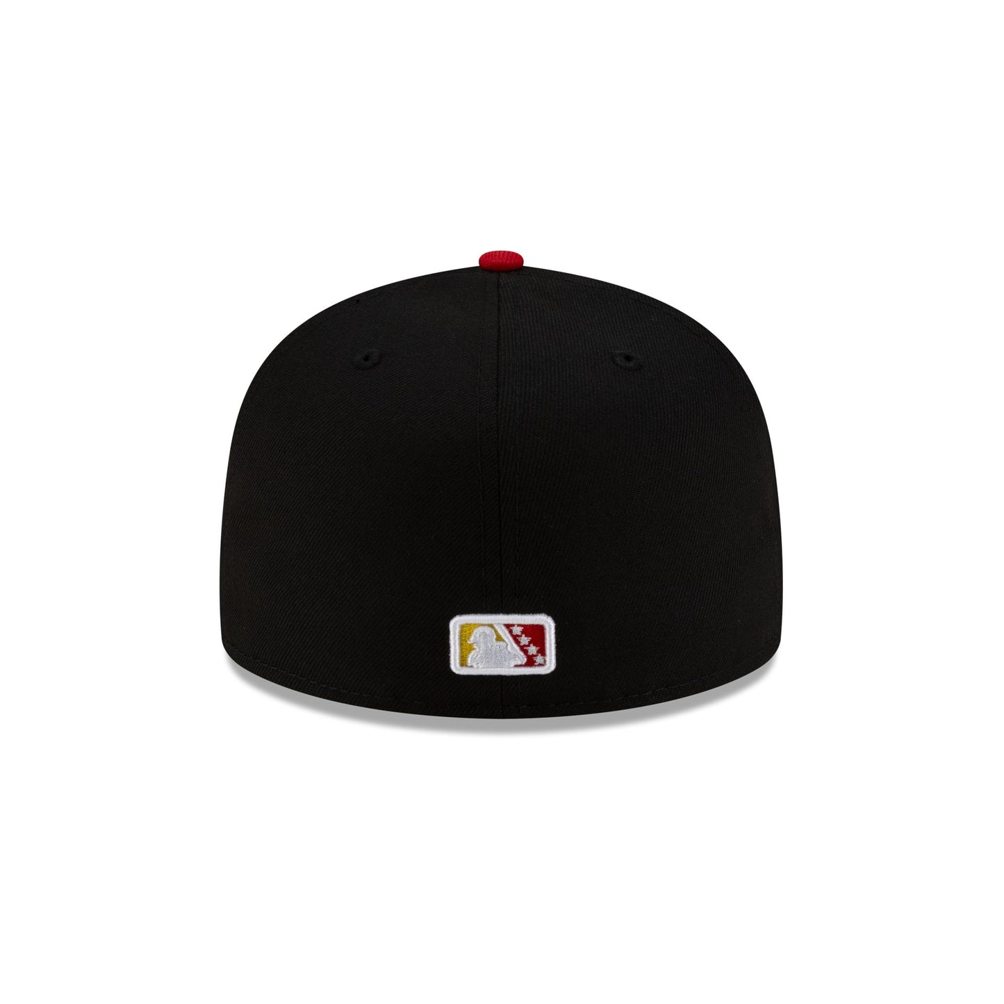 The New Hampshire Fisher Cats Black Food Pack 59FIFTY Fitted Cap features an embroidered Fisher Cats chicken tender themed logo at the front panels with a matching MiLB Batterman logo at the rear. Additional details include a Chicken Tenders team wordmark at the right-wear side with a red visor and a yellow undervisor.