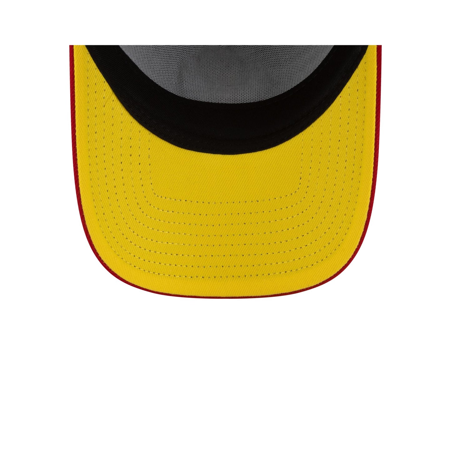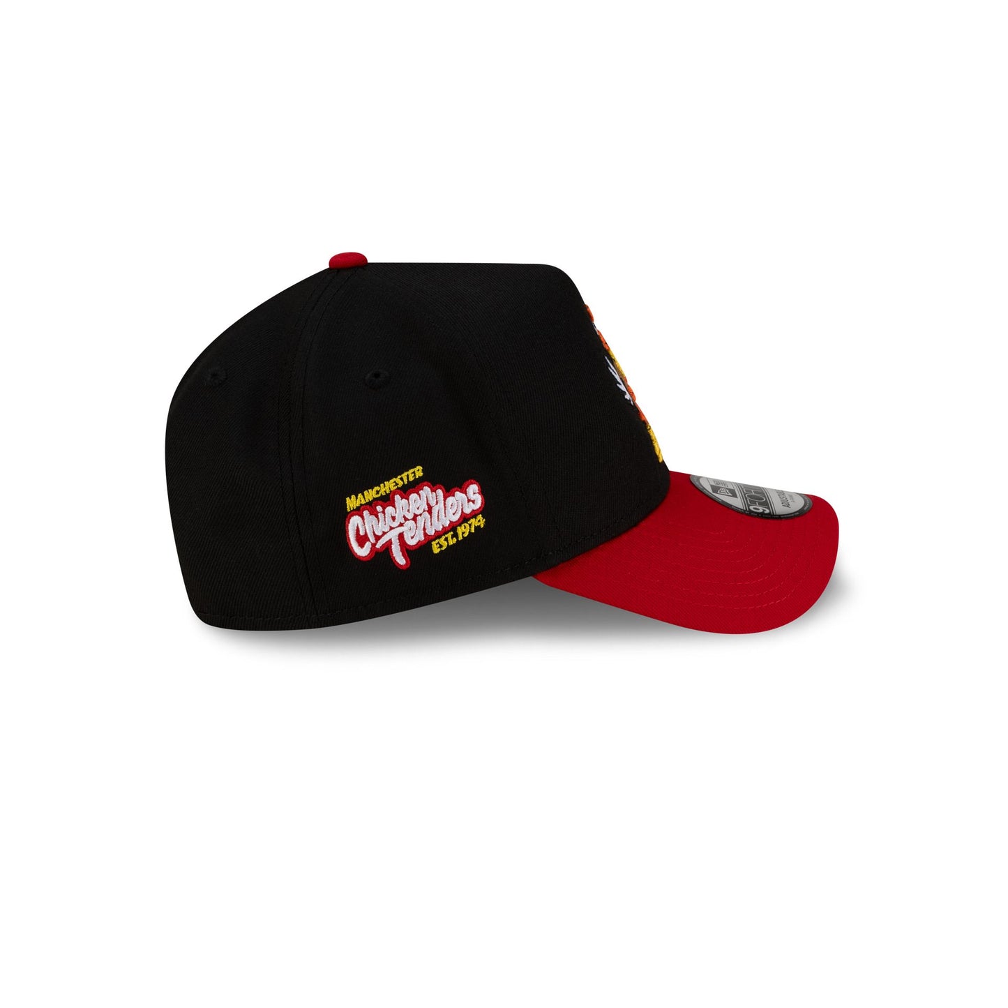 The New Hampshire Fisher Cats Black Food Pack 9FORTY A-Frame Snapback features an embroidered Fisher Cats chicken tender themed logo at the front panels with a snapback closure logo at the rear. Additional details include a Chicken Tenders team wordmark at the right-wear side with a red visor and a yellow undervisor.