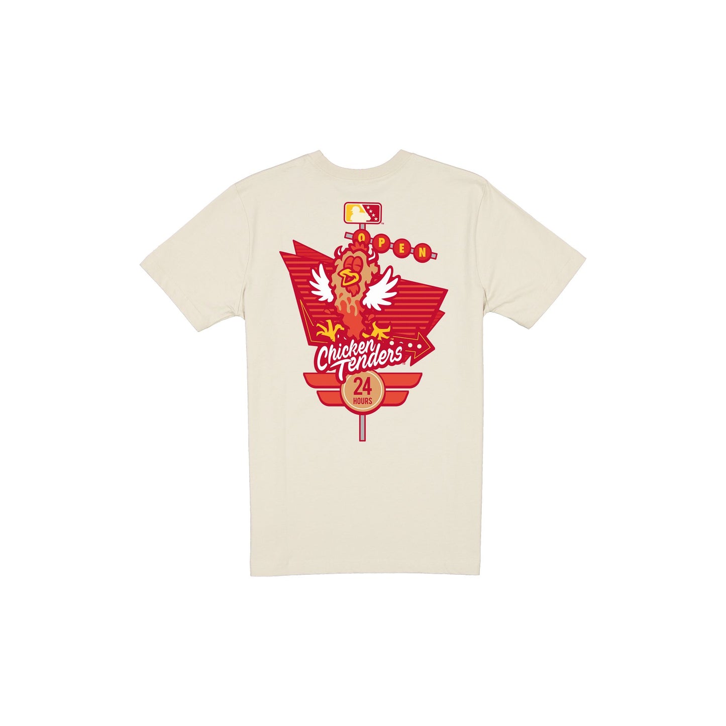 The New Hampshire Fisher Cats Chrome Food Pack T-Shirt features a screen-printed Fisher Cats Chicken Tenders themed logo at the left chest with a matching graphic at the rear.