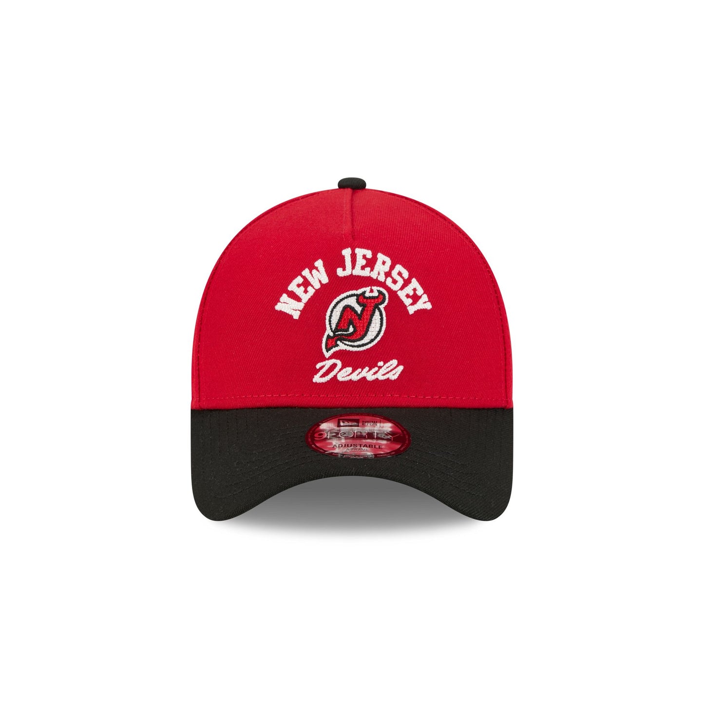 The New Jersey Devils Arched 9FORTY A-Frame Snapback features an embroidered Devils arched logo graphic at the front panels with a team graphic at the right-wear side. Additional details include the establishment date above an adjustable snapback closure at the rear and a gray undervisor.