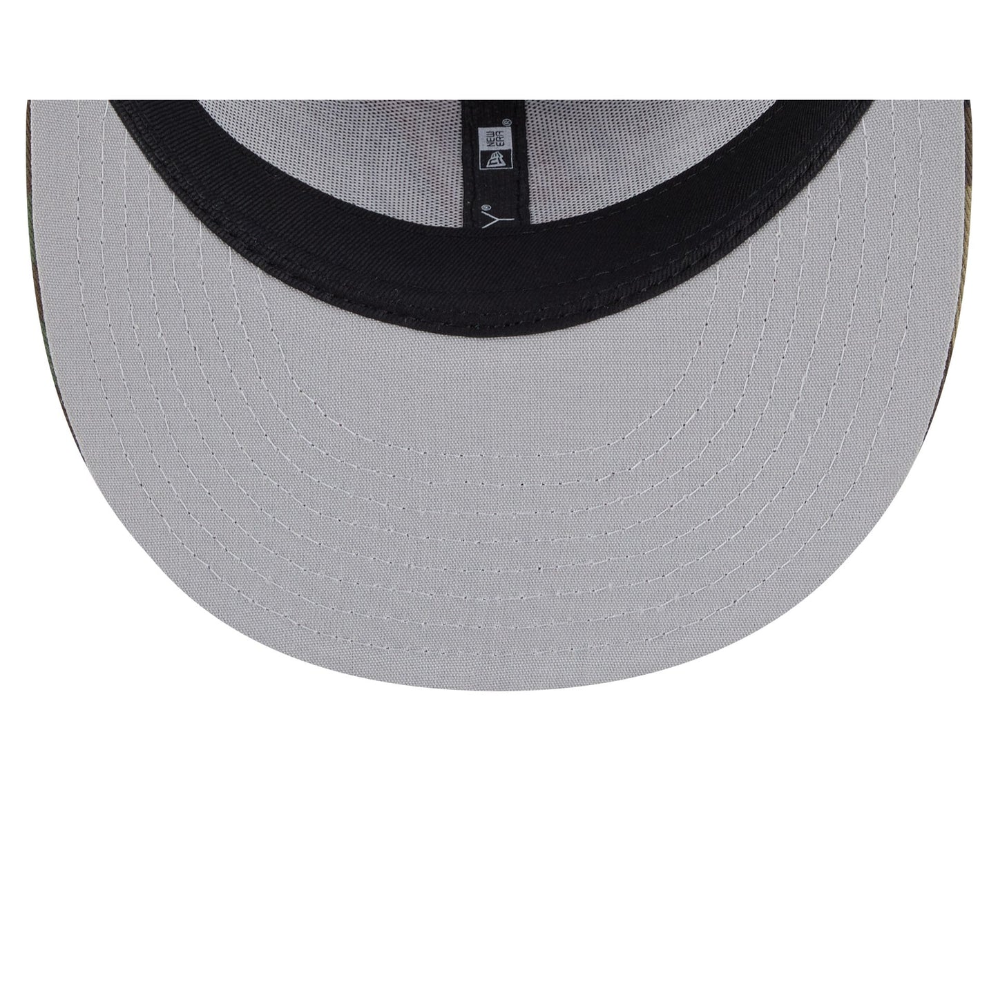 The New Jersey Devils Camo 9FIFTY Trucker features an embroidered Devils logo at the front panels with a team tag on a snapback closure at a mesh rear and a gray undervisor.