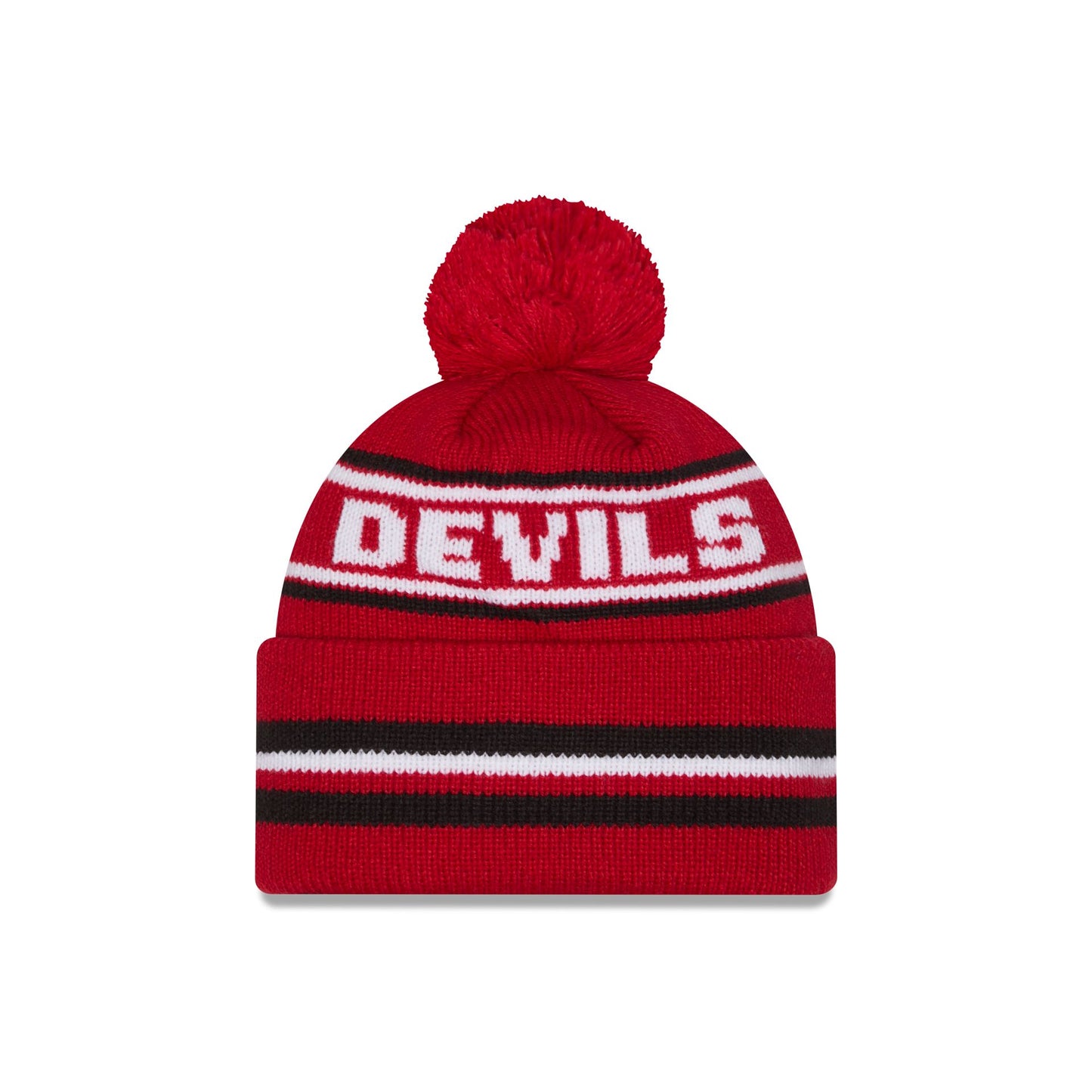 The New Jersey Devils Classic Pom Knit Hat features an embroidered Devils logo at the front cuff with a wordmark at the crown and a one-time removable pom.