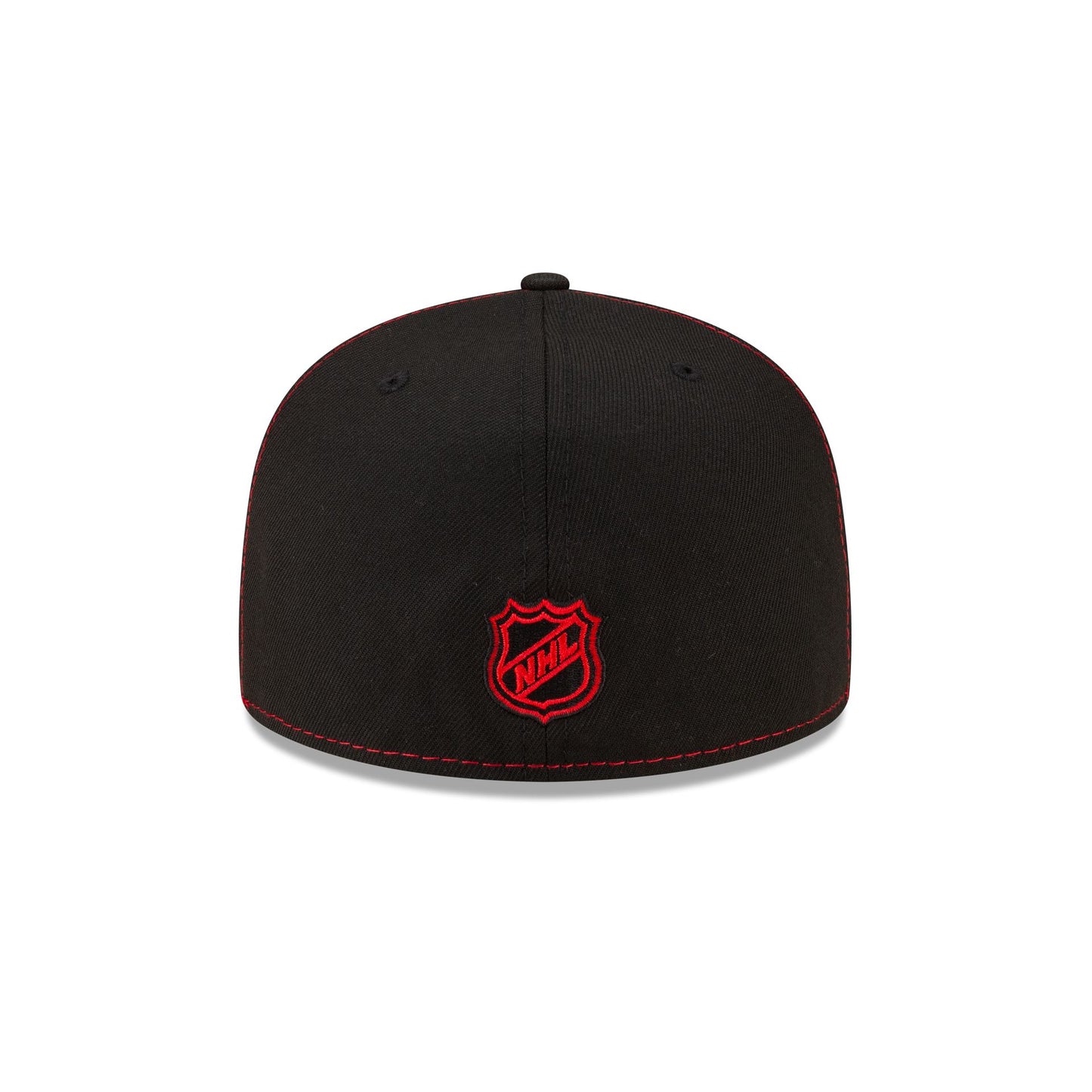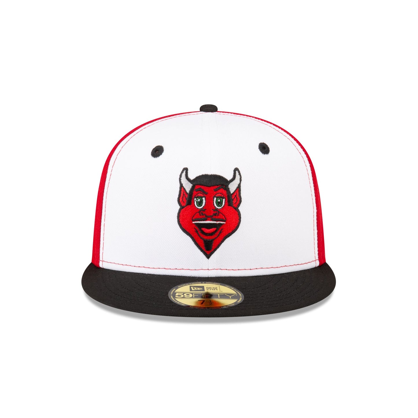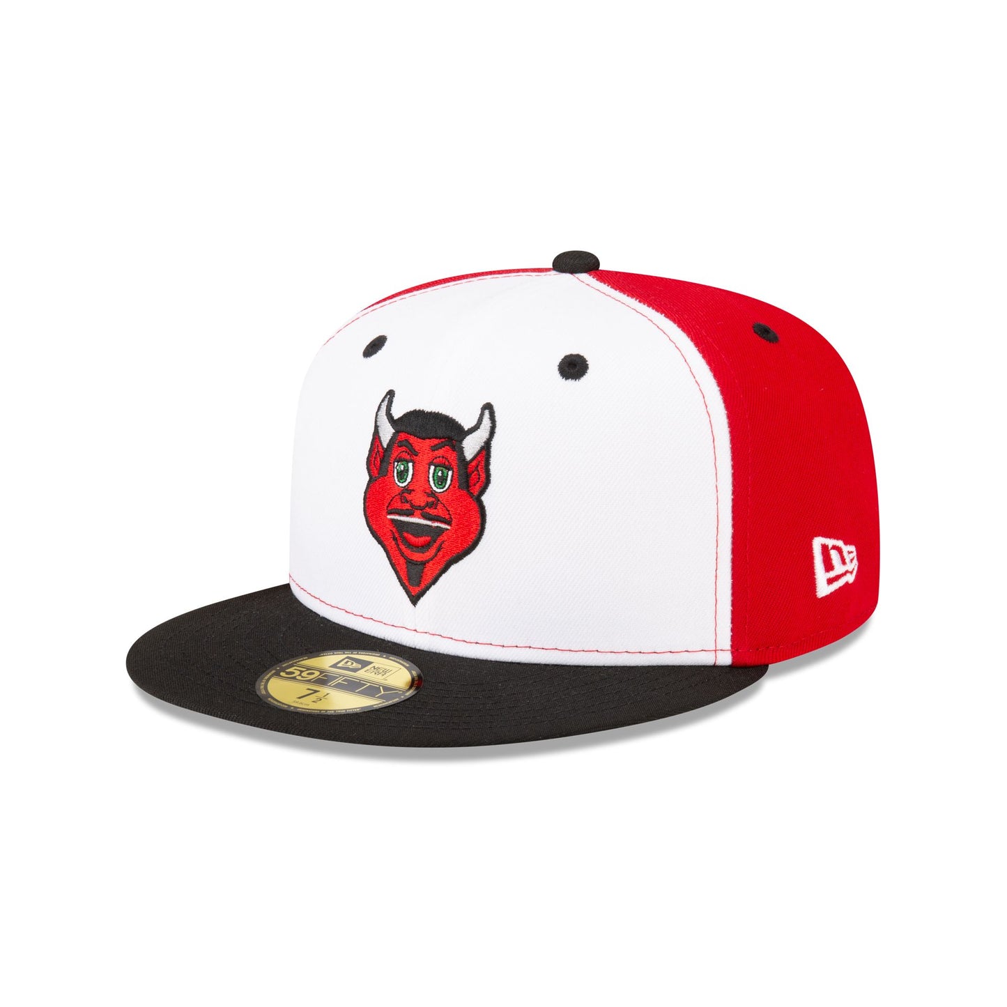 The New Jersey Devils Mascot 59FIFTY Fitted Cap features an embroidered Devils mascot at the front panels with team color paneled crown and a gray undervisor. Additional details include a team logo at the right-wear side with a matching NHL Shield at the rear.