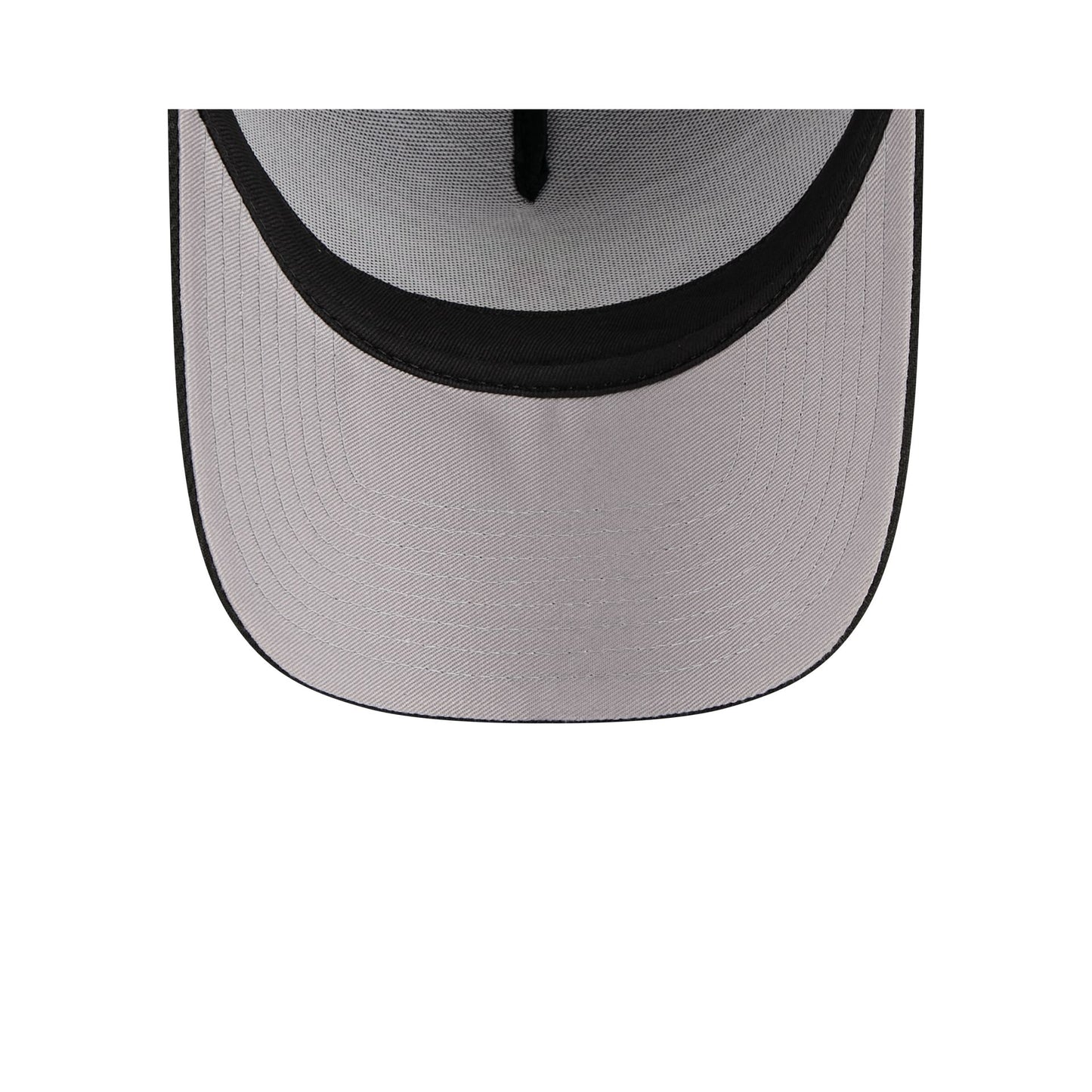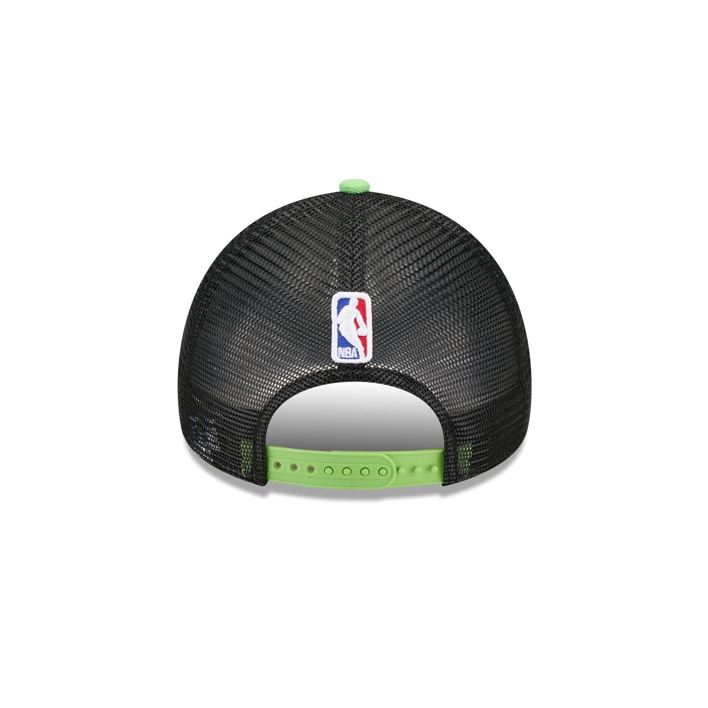 The New Orleans Pelicans 2025 City Edition 9FORTY A-Frame Trucker features an embroidered Pelicans City Edition logo at the front panels with a logo at the right-wear side. Additional details include the NBA Logoman above an adjustable snapback closure at a mesh rear and a gray undervisor.